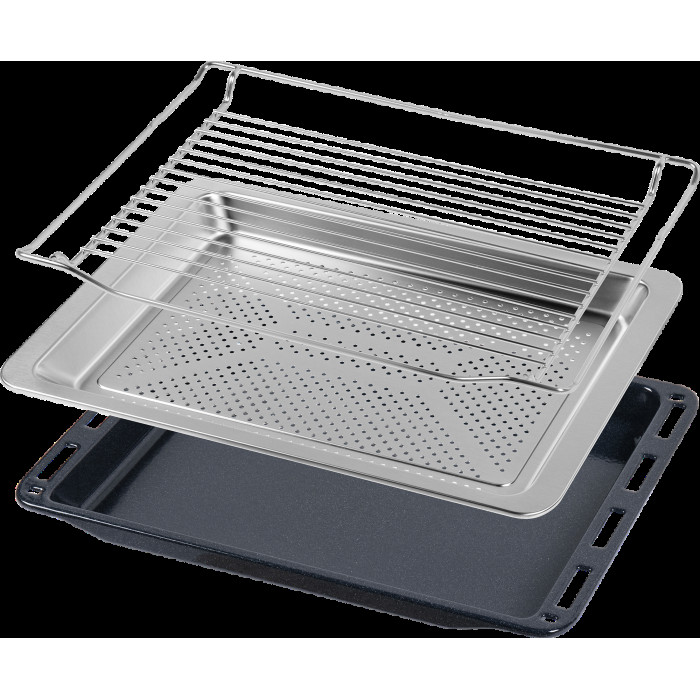 Противень перфорированный, глубокий, решетка, термощуп и инструкция на русском языке.