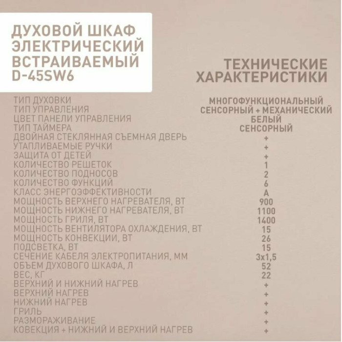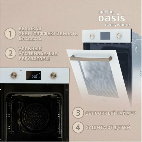 Духовой шкаф для кухни давно стал незаменимым помощником для приготовления разнообразных блюд. Духовка электрическая D-45SD6 оснащена множеством удобных функций, которые помогут приготовить вкусную и полезную еду максимально быстро и легко. Духовой шкаф электрический встраиваемый обладает функцией программирования работы духовки, классом энергоэффективности А, настраиваемым таймером, легкосъемным стеклом для простоты чистки, а также его можно разместить в любом месте на кухне, выбрав наиболее удобное расположение по высоте. Электродуховка имеет дверцу с двойным стеклом, 6 режимов работы, сенсорный+механический тип управления, утапливаемые ручки. Духовая печь имеет объем 52 л. Противень для духовки 2 шт. и решетка для духовки 1 шт. в комплекте. Цвет электро духовки - черный. Встраиваемая бытовая техника торговой марки "making Oasis everywhere" проходит сертификацию на соответствие техническому регламенту Таможенного союза. На все духовые шкафы бренда гарантия 3 года.