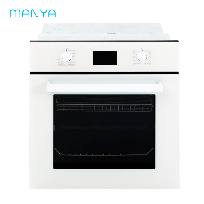 В587 х Ш595 х Г555 мм. Электрический, Объем духовки 70 л. Мощность 2750 Вт. Задний кольцевой ТЭН, нагревательный элемент Верх + Низ + Гриль. Турбо вентилятор (охлаждающий вентилятор). Количество режимов работы 10. Управление: механическое + сенсорное (Дисплей). Материал панели - стекло. Конвекция. Очистка Каталитическая. Класс энергопотребления: A. Направляющие Телескопические, Утапливаемые ручки. Остекление дверцы - 2 (съёмное). Подсветка. Цвет: Белое стекло.