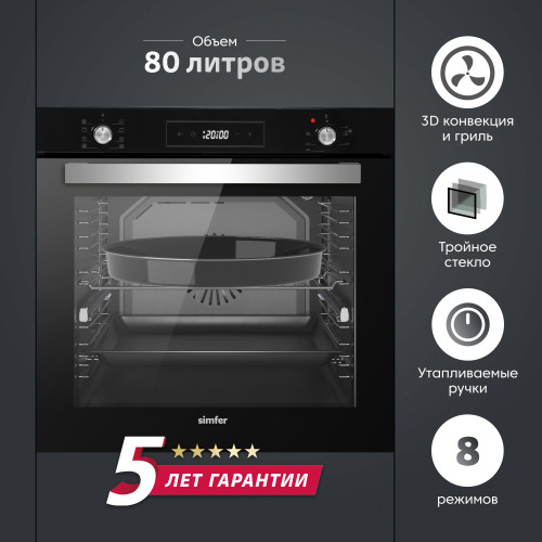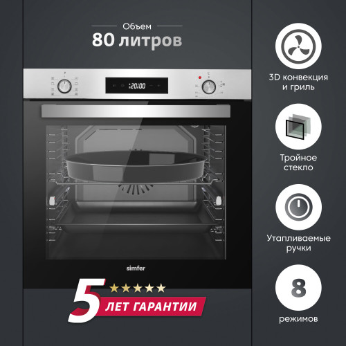 • Класс энергоэффективности А • Объем камеры духовки: 80л. • Мультифункциональная духовка • Количество режимов работы: 9 • Электрический термостат • Цифровой таймер, часы • Управление: Утапливаемые переключатели • Очистка камеры духовки– эмаль лёгкой̆ очистки чёрного цвета, паровая очистка • Количество стёкол дверцы: 3 • Внутреннее съёмное стекло лёгкой очистки • Фронтальное освещение духовки • Хромированные направляющие • Телескопические направляющие • Комплектация: 1 стандартный противень с антипригарным покрытием, хромированная решётка, доп. круглый противень • Цвет: серый