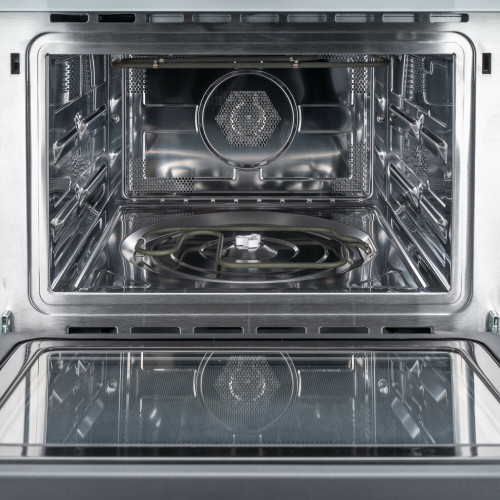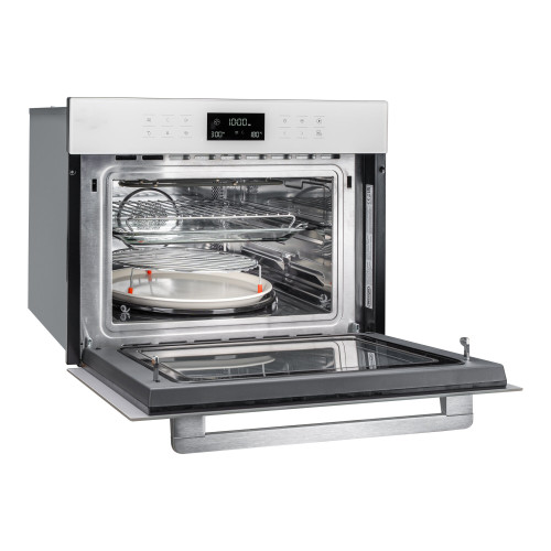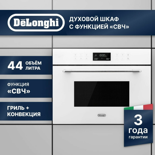 Компактный духовой шкаф с функцией СВЧ; Объем 44 л; Мощность 3350Вт; 3 уровня рельефных направляющих; Гриль ТЭН; Сенсорное управление; Цифровой дисплей; Выходная мощность 900 Вт; Мощность гриля 1000 Вт; 5 уровней мощности; Быстрый старт 30 сек; Автоматическая разморозка (2 авто программы); 13 режимов автоматического приготовления; 7 программ в режиме дузового шкафа (подсветка, конвекция, гриль, гриль+конвекция, размораживание, пицца, быстрый разогрев); 4 программы в режиме СВЧ (СВЧ, СВЧ+конвекция, СВЧ+гриль+конвекция, СВЧ+пицца, СВЧ+гриль); Быстрый предварительный нагрев, пауза; Таймер на 95 мин; Часы;3 стекла; Внутреннее освещение; Внутреннее покрытие - нержавеющая сталь; Ручное открывание дверцы; Система безопасности: блокировка от детей, защита от перегрева, охлаждающий вентилятор, система обнаружения неисправностей; 1 эмалированный поворотный стол 360 мм, 1 стеклянный поднос, 1 противень, 2 решетки для гриля; (ШхГхВ), мм: 595*568*454; Цвет: белое стекло