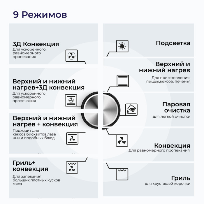 верхний нагрев, верхний нагрев + конвекция, верхний нагрев + нижний нагрев, верхний нагрев + нижний нагрев + конвекция, гриль + конвекция, нижний нагрев, нижний нагрев + конвекция