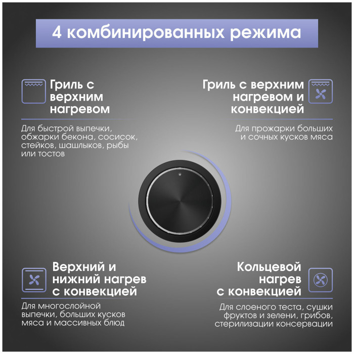 большой гриль, верхний нагрев + нижний нагрев, конвекция