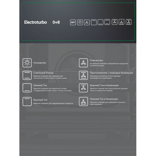 верхний нагрев, верхний нагрев + конвекция, верхний нагрев + нижний нагрев, верхний нагрев + нижний нагрев + конвекция, конвекция, нижний нагрев, нижний нагрев + конвекция