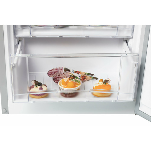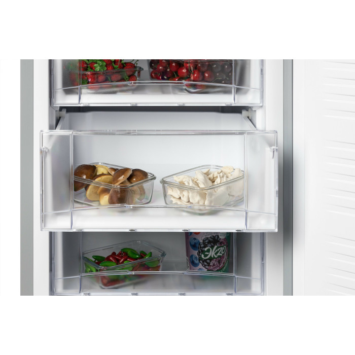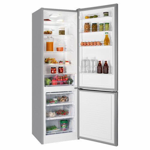 Двухкамерный отдельностоящий холодильник NORDFROST NRB 134 S с нижним расположением морозильной камеры имеет общий объем 338 л.
