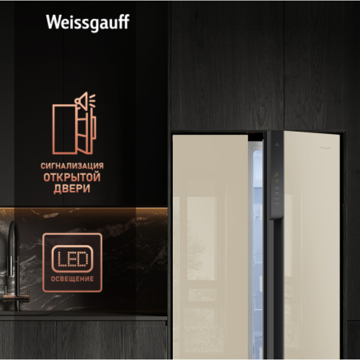 Отдельностоящий холодильник Weissgauff, выполненный в современном европейском дизайне Side-by-Side в закаленном стекле бежевого цвета, обладающий полной системой размораживания Full No Frost и полностью электронным управлением - это соотношение фантастической вместительности, безупречной эргономики внутреннего пространства, технологического совершенства и великолепного дизайна!