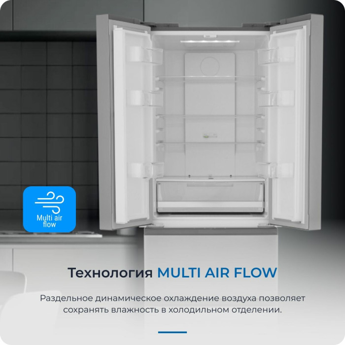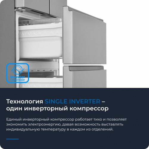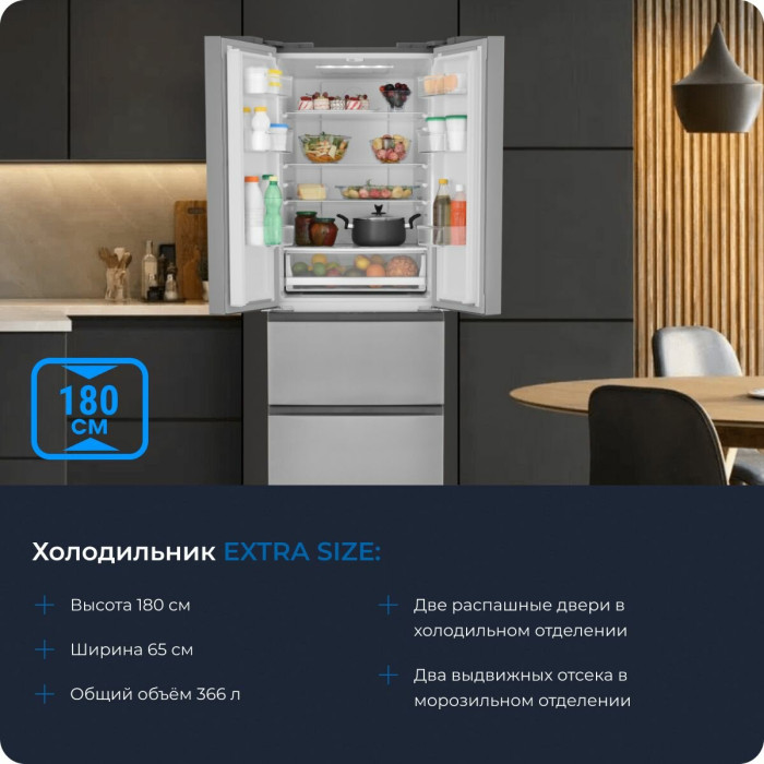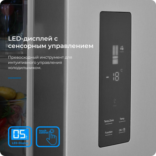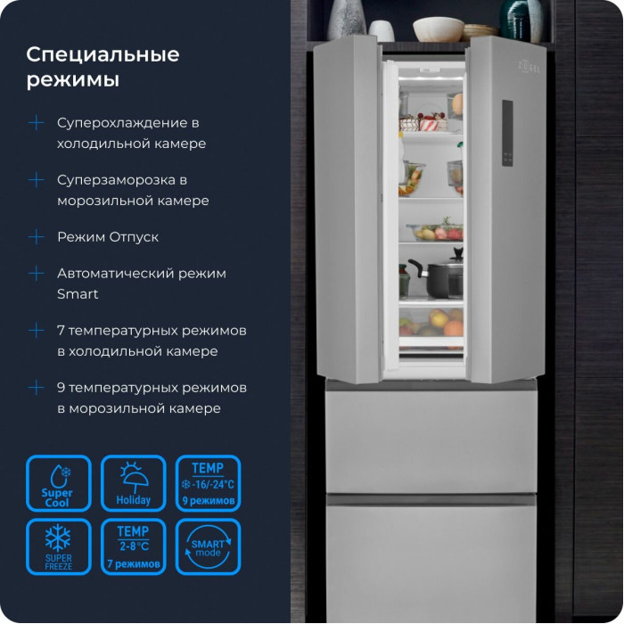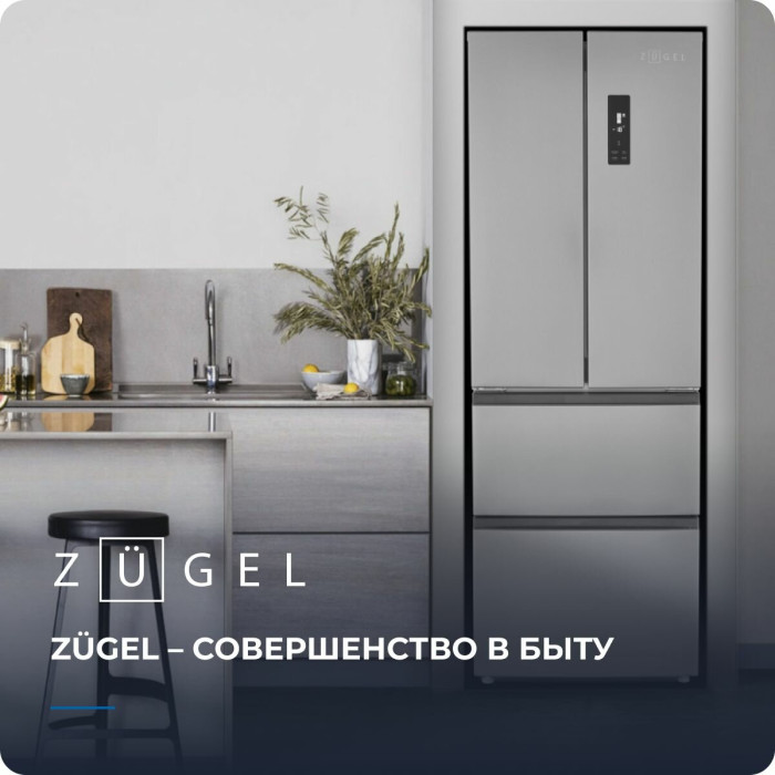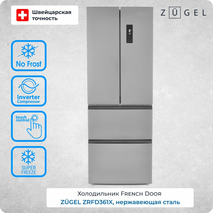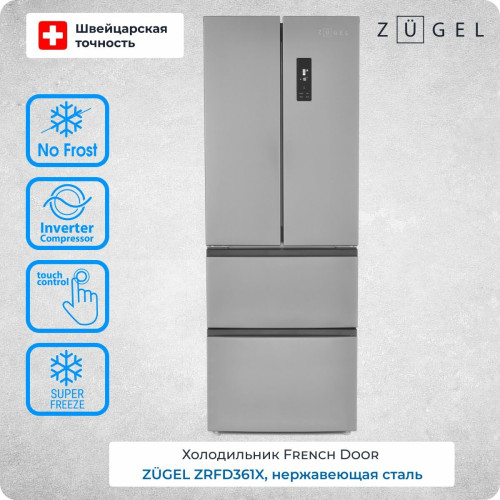 Холодильник комбинированный French Door ZUGEL ZRFD361X - это современное и функциональное решение для хранения продуктов. Общий объем холодильника составляет 366 литров, что позволяет хранить продукты на протяжении нескольких недель.