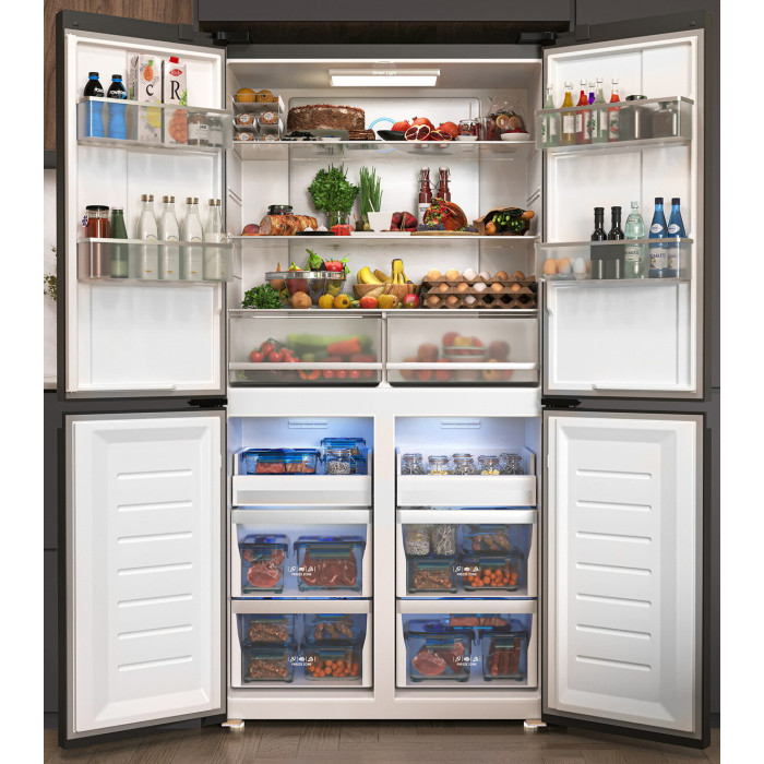Холодильник LEX LCD 505 станет отличным выбором для большой семьи и стильной кухни. Объем 505 литров позволит разместить все, чего вам захочется. Охлаждение и заморозка происходят по системе No Frost, без образования инея, поэтому вам не нужно тратить время на размораживание. Современный инверторный компрессор работает эффективнее, тише и быстрее обычного, а технология LEX Volume Stream Air обеспечивает более равномерное охлаждение. Задняя стенка холодильной камеры покрыта металлом с высокой теплопроводностью, благодаря чему система охлаждения быстрее выравнивает колебания температуры. Модель типа CROSS DOOR имеет верхнее холодильное и два независимых нижних морозильных отделения. Такая конструкция помогает поддерживать подходящие условия хранения внутри каждой камеры, даже если вы часто открываете дверцы. Диапазон температур: 823 C, но с функцией суперзаморозки можно быстро снизить температуру в морозильном отделении до 28 С. Похожий режим есть и в холодильной камере. Холодильник оснащен функцией сохранения температуры в течение 12 часов, которая выручит при отключении электричества. Благодаря понятной электронной панели управления и яркой подсветке вы всегда сможете точно контролировать условия хранения. А когда такой возможности нет, будет достаточно одного нажатия, чтобы автоматически установить в каждом отделении температуры, которые позволяют экономить энергию, но не влияют на качество хранения продуктов.