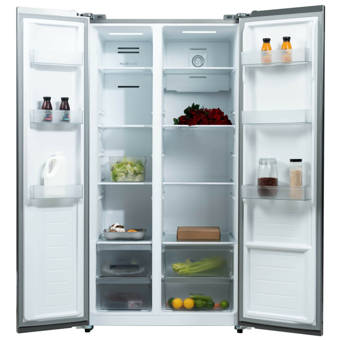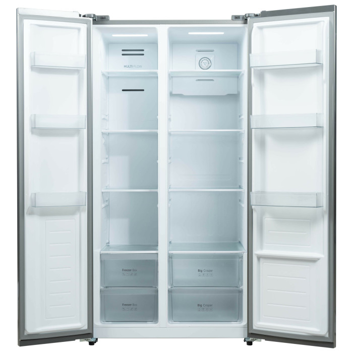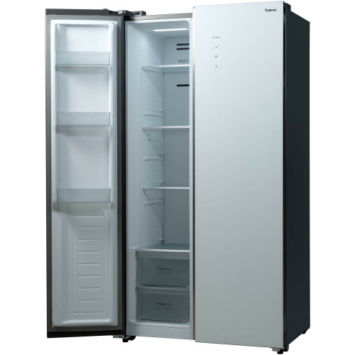 Холодильник Бирюса SBS 541 TWG — это современное устройство с текстурированным белым стеклом, идеально подходящее для современных интерьеров. Он сочетает в себе стильный дизайн и функциональность, предлагая широкий объем для хранения продуктов и удобные функции.