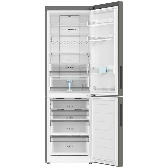 Двухкамерный холодильник с нижним расположением морозильной камеры Общие данные: Размеры: высота (см): 190,5 ширина (см): 59,5 глубина (см): 67,2 Общий объем/ Полезный объем: Холодильника (л): 364/- Холодильной камеры (вкл. зону свежести) (л): 256/- Морозильной камеры (л): 108/- Зона свежести: 21 л Тип управления: электронный Класс энергопотребления: A+ Климатический класс: SN-ST (от +10°С до +38°С) Количество компрессоров: 1 Годовое потребление энергии: 342 кВтч Цвет: нержавеющая сталь Холодильное отделение: 5 полок из закаленного стекла Количество полок на двери: 4 Складная полка Зона сохранения свежести Система No Frost (Frost Free, Ноу Фрост) Светодиодное освещение Функция суперохлаждения Антибактериальная защита Ящик для овощей Складная полка для бутылок Морозильное отделение: Система No Frost (Frost Free, Ноу Фрост) Мощность замораживания: 12 кг/сутки Функция суперзамораживания 4 ящика Дополнительная информация: Сигнал открытой двери Функция Отпуск Smart компрессор Уровень шума: 42 дБ Передние/задние регулируемые ножки Перенавешиваемые двери