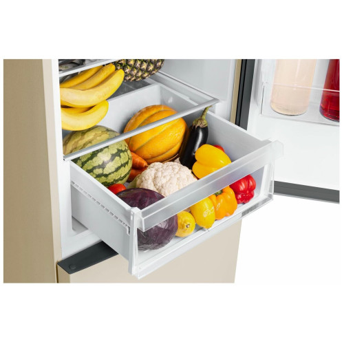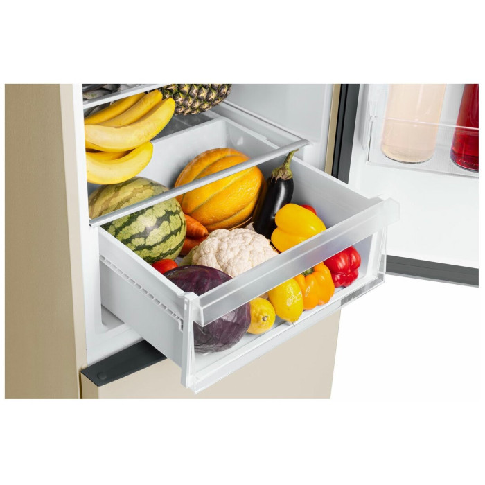 Двухкамерный холодильник с нижним расположением морозильной камеры Общие данные: Размеры: высота (см): 200 ширина (см): 59,5 глубина (см): 65 Общий объем/ Полезный объем: Холодильника (л): -/368 Холодильной камеры (л): -/263 Морозильной камеры (л): -/105 Тип управления: электронный Класс энергопотребления: A Климатический класс: ST (от +18°C до +38°C) Количество компрессоров: 1 Годовое потребление энергии: 380 кВтч Цвет: бежевый Холодильное отделение: Полки из стекла Система No Frost (Frost Free, Ноу Фрост) Светодиодное освещение Функция суперохлаждения Ящик для овощей Морозильное отделение: Система No Frost (Frost Free, Ноу Фрост) Мощность замораживания: 12 кг/сутки Функция суперзамораживания 3 ящика Дополнительная информация: LED-дисплей Режим "Отпуск" Блокировка управления Уровень шума: 39 дБ Перенавешиваемые двери Предупреждающий сигнал об открытой двери Память в случае отключения электроэнергии