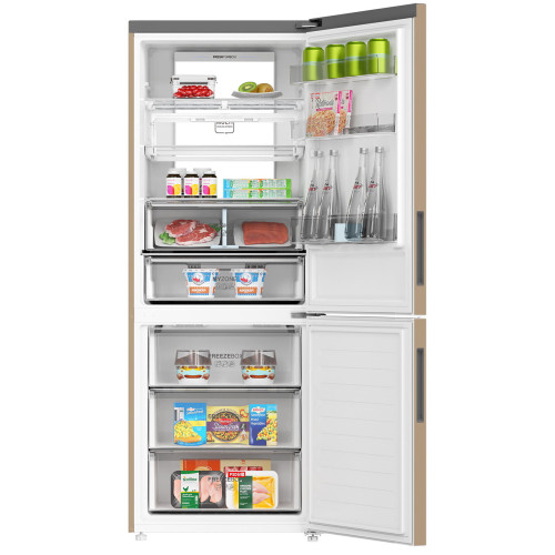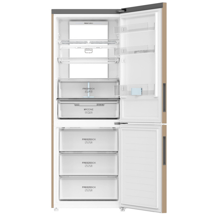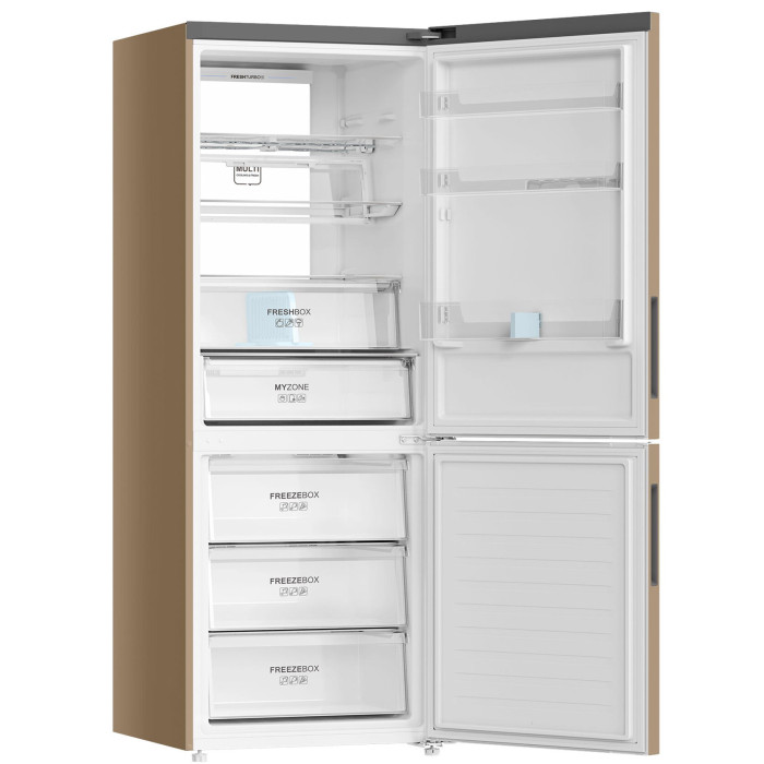 Классический двухкамерный холодильник с технологией Total No Frost — нет наледи в отделениях, никакого ручного размораживания. Отличный обзор — видно все продукты, благодаря светодиодной колонне Tower LED. Специально разработанная двойная складная винная полка обеспечивает максимальное удобство и вариативность хранения. В контейнере 0° Zone качественно сохраняются морепродукты, мясные деликатесы, сыры и молочные продукты, а мембранная технология контроля влажности HCS улучшает условия хранения овощей и фруктов. Особенности: 0° Zone Регулируемая влажность и температура около 0 градусов — специальная зона для качественного хранения мяса, рыбы, морепродуктов, сыров и молочных продуктов. Поддержание влажности HCS Респираторная мембрана отводит лишнюю влажность, если ее уровень более 90%, или накапливает влагу при излишне сухом воздухе. Овощи и фрукты дольше остаются свежими. Fresh Turbo Использование ультрафиолетового излучения в холодильном отделении сдерживает развитие бактерий, плесени, неприятных запахов и позитивно влияет на срок и качество хранения продуктов. Нижняя складная полка Складные полки служат вариативности внутреннего пространства холодильника. Теперь легко поместятся и большие кастрюли, и высокие ёмкости, и другие «негабаритные» продукты. Инверторный компрессор эффективность и тихая работа Tower LED Tower LED освещение на задней стенке холодильного отделения Wi-Fi управление Wi-Fi управление управление с помощью смартфона или планшета Поддержка мобильного приложения evo Управляйте вашим холодильником удаленно. С помощью evo контролируйте и настраивайте температуру охлаждения в камерах, получайте уведомление об охлаждении напитков или другие важные оповещения на экран смартфона. Общие данные: Размеры: высота (см): 190 ширина (см): 70 глубина (см): 68,2 Общий объем/ Полезный объем: Холодильника (л): -/439 Холодильной камеры (вкл. зону свежести) (л): -/303 Морозильной камеры (л): -/136 Тип управления: электронный Класс энергопотребления: A++ Климатический класс: SN-T (от +10 до +43 С) Количество компрессоров: 1 Годовое потребление энергии: 317 кВтч/год Цвет: золотистый Холодильное отделение: Полки из закаленного стекла: 3 Складная полка Количество полок на двери: 3 Зона свежести MyZone с возможностью выбора режима работы («Фрукты и овощи» - «Свежесть при 0 °C» - «Мягкая заморозка») Система No Frost (Frost Free, Ноу Фрост) Светодиодная подсветка Быстрое охлаждение Ящик для овощей Морозильное отделение: Система No Frost (Frost Free, Ноу Фрост) Мощность замораживания, кг/24 ч: 12 Быстрая заморозка Количество выдвижных ящиков: 3 Цвет выдвижных ящиков: Прозрачный Дополнительная информация: Покрытие: Металлик Тип компрессора: Инвертор Поддержка мобильного приложения evo Напряжение/Частота: 220-240 V / 50Hz Уровень шума дБ (А): 38 Классический двухкамерный холодильник с технологией Total No Frost — нет наледи в отделениях, никакого ручного размораживания. Отличный обзор — видно все продукты, благодаря светодиодной колонне Tower LED. Специально разработанная двойная складная винная полка обеспечивает максимальное удобство и вариативность хранения. В контейнере 0° Zone качественно сохраняются морепродукты, мясные деликатесы, сыры и молочные продукты, а мембранная технология контроля влажности HCS улучшает условия хранения овощей и фруктов. Особенности: 0° Zone Регулируемая влажность и температура около 0 градусов