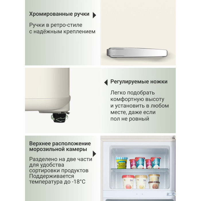 отделение для овощей и фруктов, лоток для льда, лоток для яиц, регулируемые ножки
