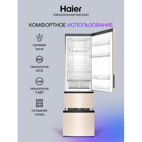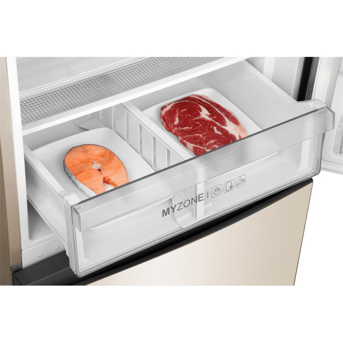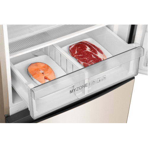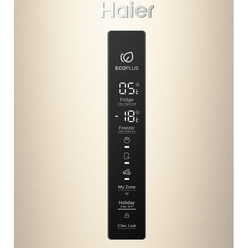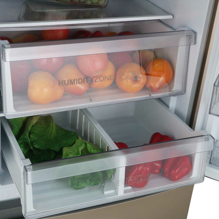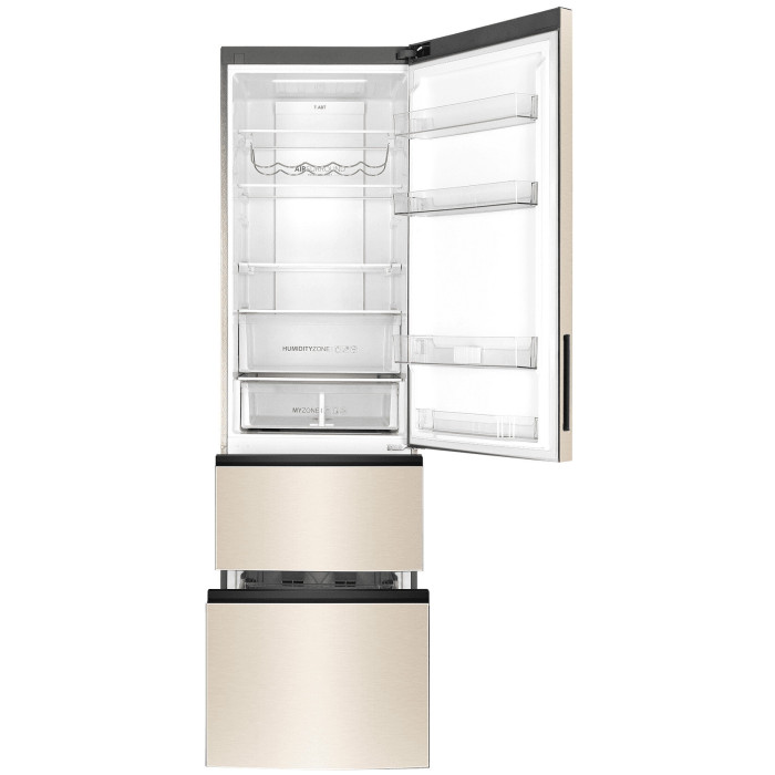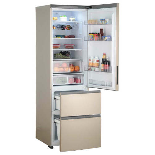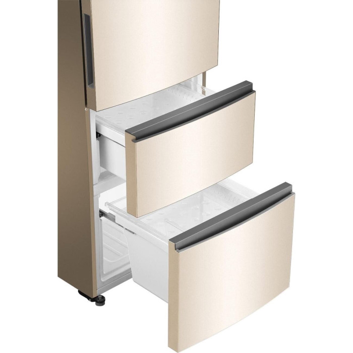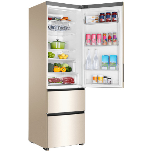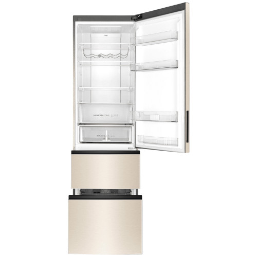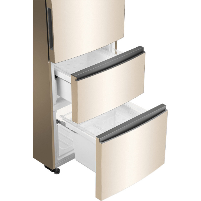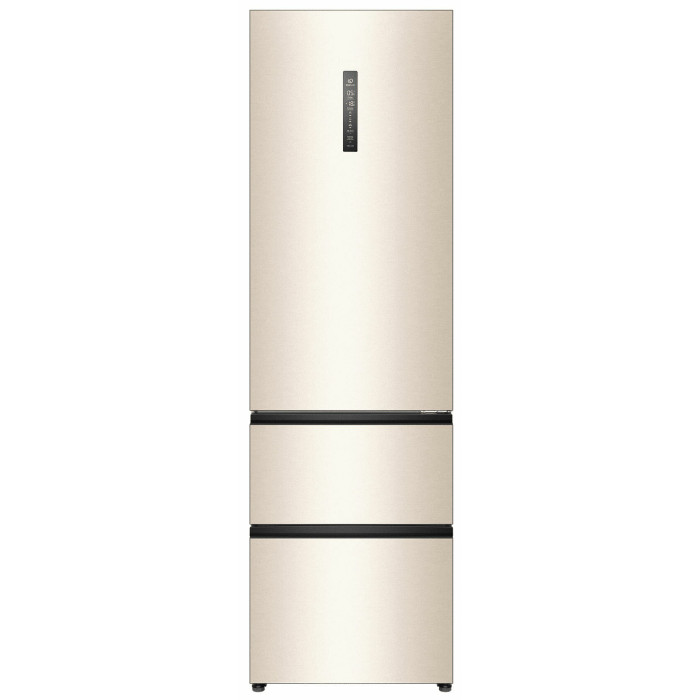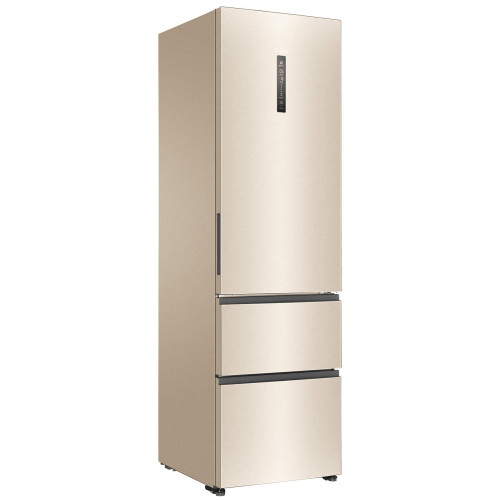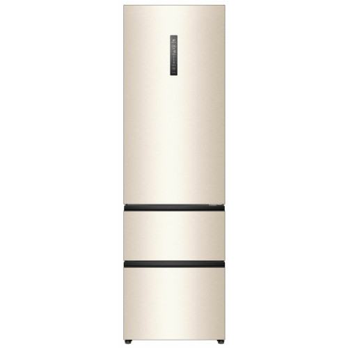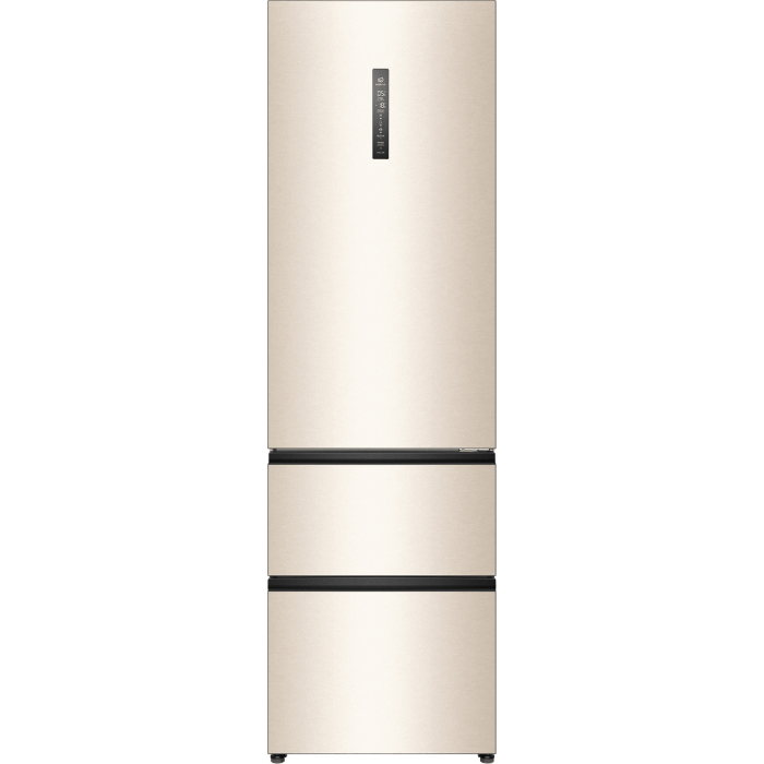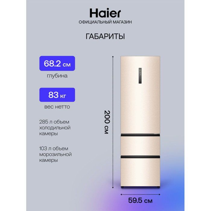 Общие данные: Размеры: высота (см): 200 ширина (см): 59,5 глубина (см): 68,2 Общий объем/ Полезный объем: Холодильника (л): 388/- Холодильной камеры (вкл. зону свежести) (л): 285/- Морозильной камеры (л): 103/- Тип управления: электронный Класс энергопотребления: A+ Климатический класс: SN-T (от +10°C до +43°C) Количество компрессоров: 1 Цвет: золотистый Холодильное отделение: Полки из закаленного стекла Складная полка Регулируемое зона свежести MyZone Система No Frost (Frost Free, Ноу Фрост) Светодиодное освещение Tower Ящик для овощей и фруктов с регулировкой влажности HumidityBox Лоток для яиц: на 10 яиц Складная полка для вина Морозильное отделение: Система No Frost (Frost Free, Ноу Фрост) 2 выдвижных ящика Дополнительная информация: Тип компрессора: Инвертор Удаленное управление через Wi-Fi Конденсатор: Скрытый Перенавешиваемые двери Уровень шума дБ: 36 Тип хладагента: R600a