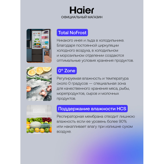 Сенсорное управление; Светодиодное освещение; Освещение морозильной камеры; Регулировка температуры в зоне сохранения свежести; Подогрев контура двери; Ионизатор; Открывание дверей вправо; Полка для бутылок