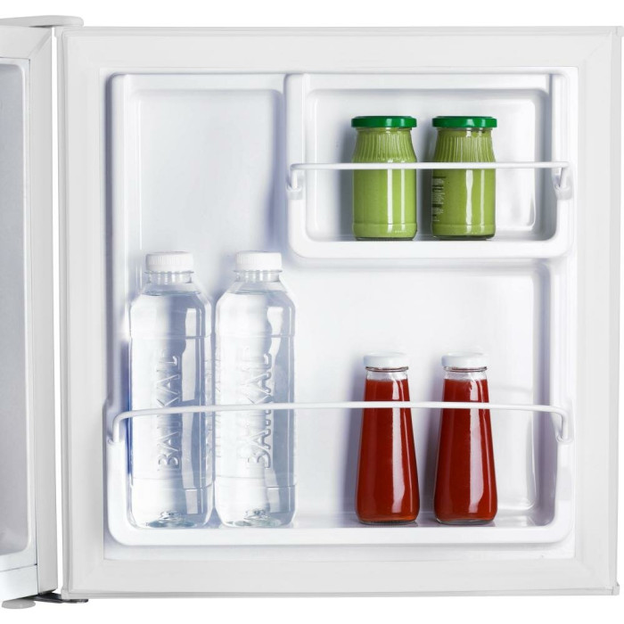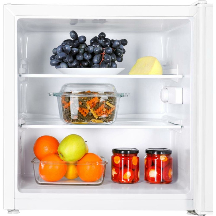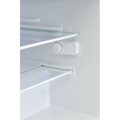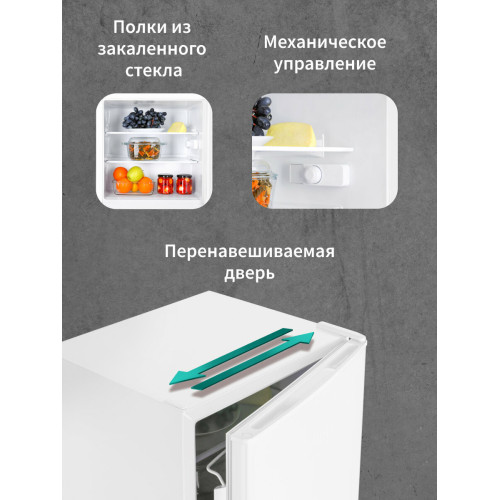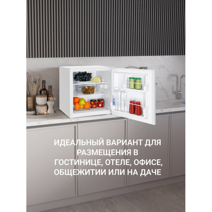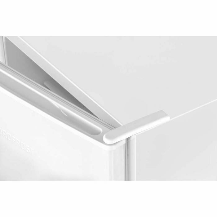 конденсатор интегрирован в боковую панель, ламинированная внутренняя поверхность холодильника, в ХК: 2 полки, освещение отсутствует, 2 полки на двери