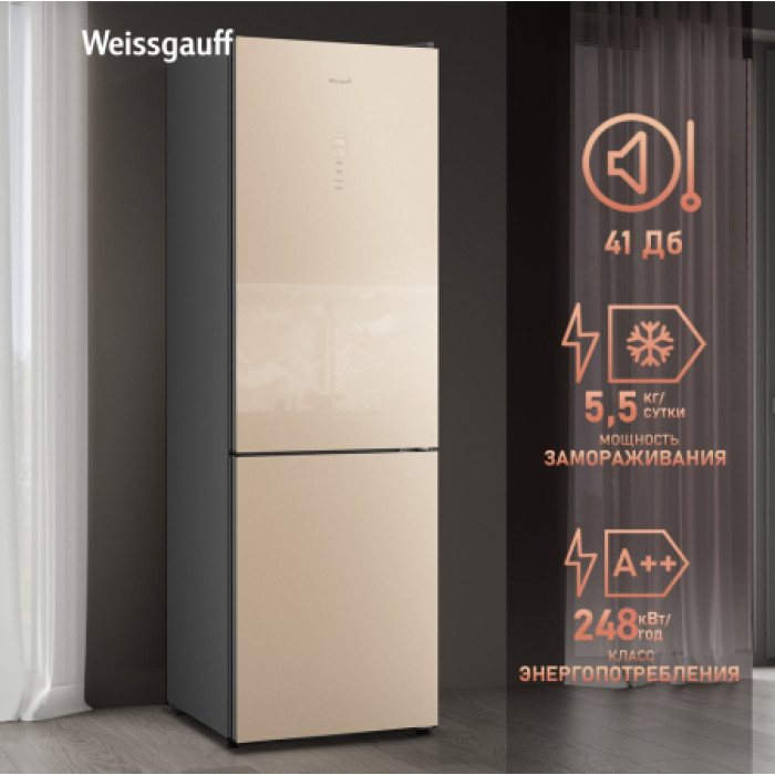 Отдельностоящий холодильник Weissgauff оснащенный инверторным двигателем, выполненный в дизайне закаленное стекло бежевого цвета, обладающий полной системой размораживания Total No Frost и фантастической вместительностью - это соотношение превосходной эргономики внутреннего пространства, технологического совершенства и великолепия внешнего дизайна!