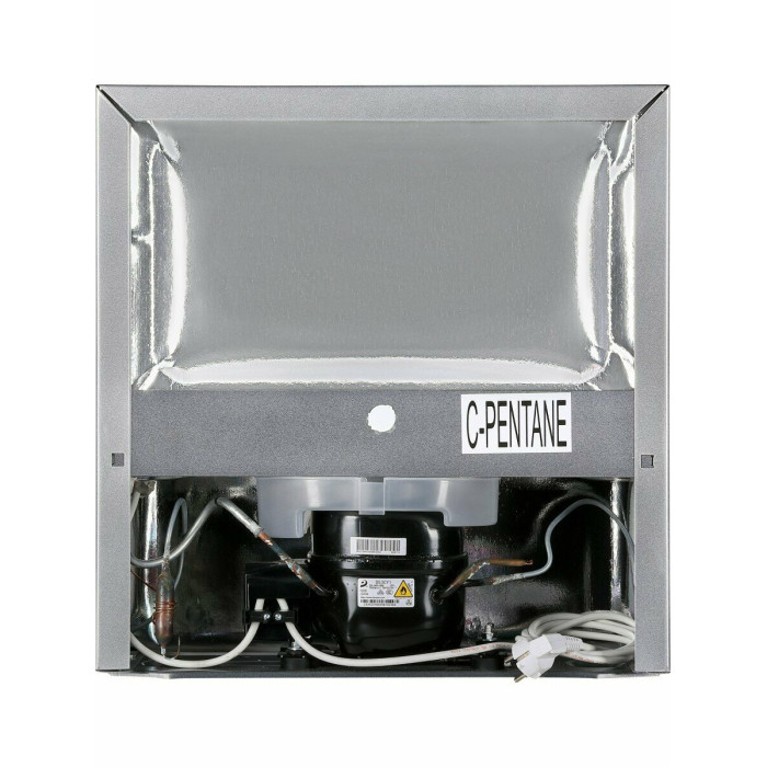 конденсатор интегрирован в боковую панель, ламинированная внутренняя поверхность холодильника, в ХК: 2 полки, освещение отсутствует, 2 полки на двери