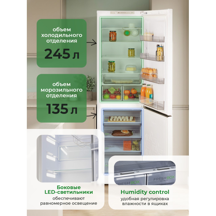 масленка, контейнер для яиц, выдвижной лоток, ящики для овощей и фруктов с регулировкой влажности, две складные полки, подвесная полка для бутылок