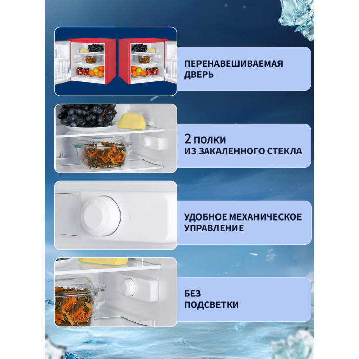 конденсатор интегрирован в боковую панель, ламинированная внутренняя поверхность холодильника, в ХК: 2 полки, освещение отсутствует, 2 полки на двери