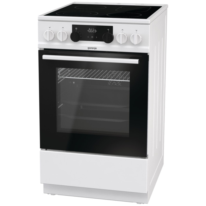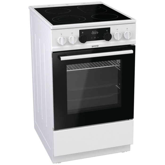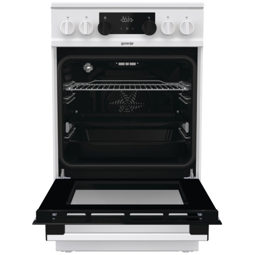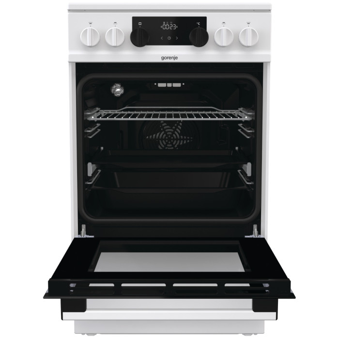 Электрическая плита Gorenje ECS5350WA имеет вместительный духовой шкаф, что позволяет готовить индейку или курицу целиком, а также выпекать кексы и пирог на разных уровнях. В арсенале есть гриль, предназначенный для создания хрустящей корочки на птице или мясе. Режим конвекции активирует вентилятор, который обеспечивает равномерное распределение воздуха внутри камеры. Галогенная лампа ярко освещает пространство, поэтому есть возможность контролировать кулинарный процесс. Электрическая плита Gorenje ECS5350WA оборудована стеклокерамической варочной поверхностью. Четыре конфорки разного размера и мощности позволяют готовить несколько блюд одновременно. Управление осуществляется посредством поворотных переключателей и сенсорных клавиш. Для удобства информация отображается на дисплее. Механический таймер разработан для установки времени приготовления блюда. Для хранения посуды есть специальный ящик.