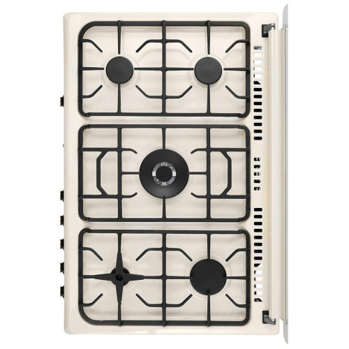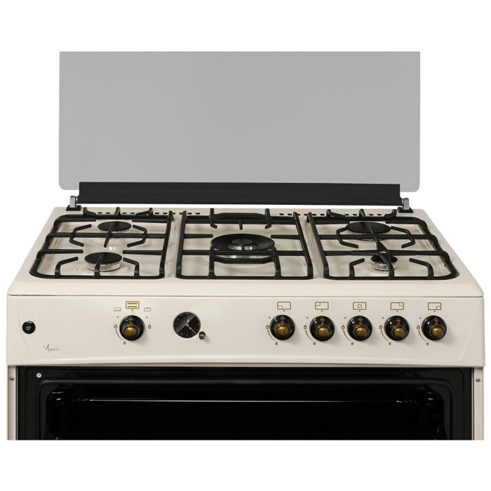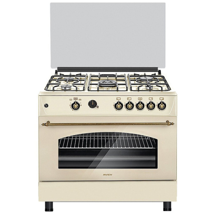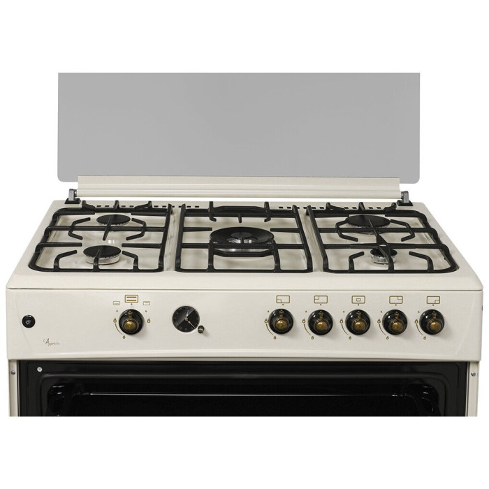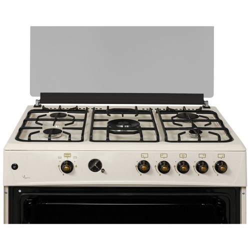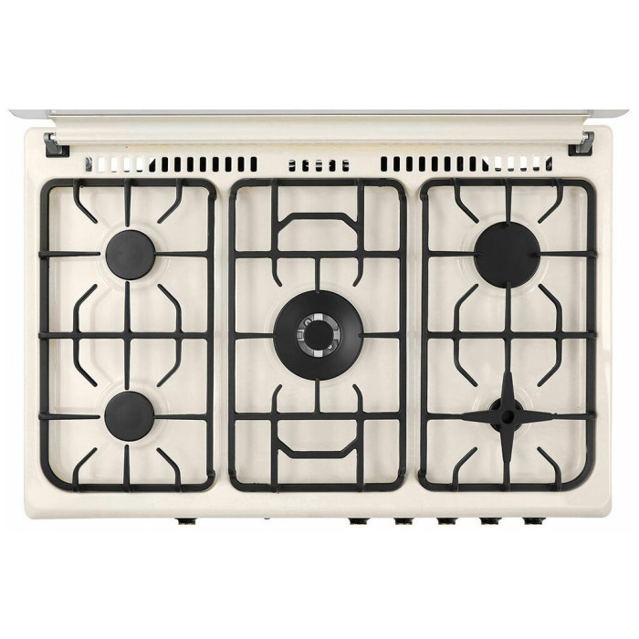тип: газовая, тип духовки: газовая, тип варочной панели: газовая, материал рабочей поверхности: эмалированная сталь, ширина: 90 см, глубина: 60 см, количество конфорок: 5, электроподжиг: варочная поверхность + духовой шкаф, газ-контроль: конфорок, духовки, гриль, особенности конструкции: часы, ящик для посуды, подсветка духовки, дополнительные функции: таймер, тип таймера: звуковой