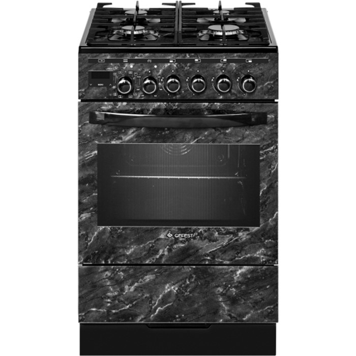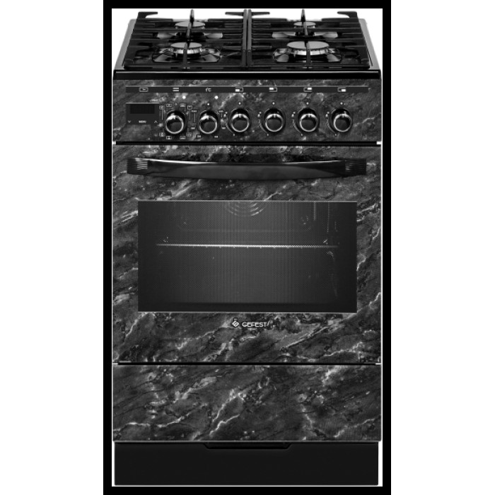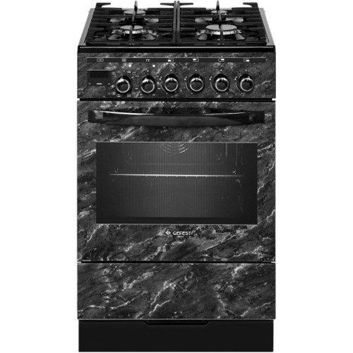 тип: комбинированная, тип духовки: электрическая, тип варочной панели: газовая, материал рабочей поверхности: закаленное стекло, ширина: 50 см, глубина: 58.50 см, количество конфорок: 4, электроподжиг: варочная поверхность, газ-контроль: конфорок, гриль, особенности конструкции: дисплей, дополнительные функции: термостат, тип таймера: звуковой, очистка духовки: традиционная