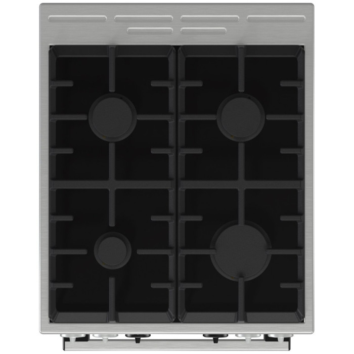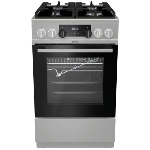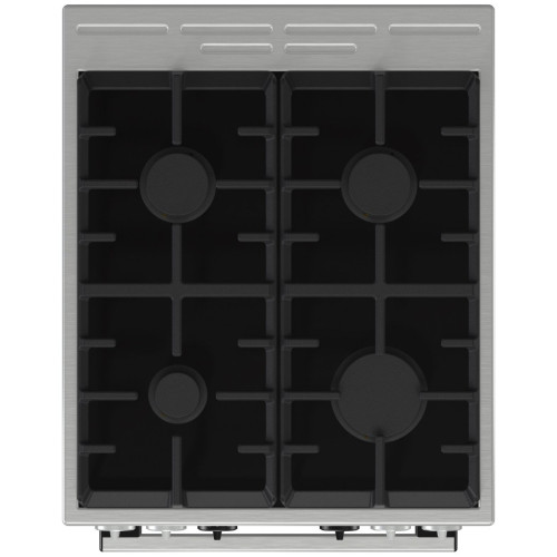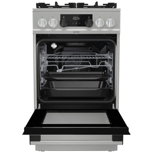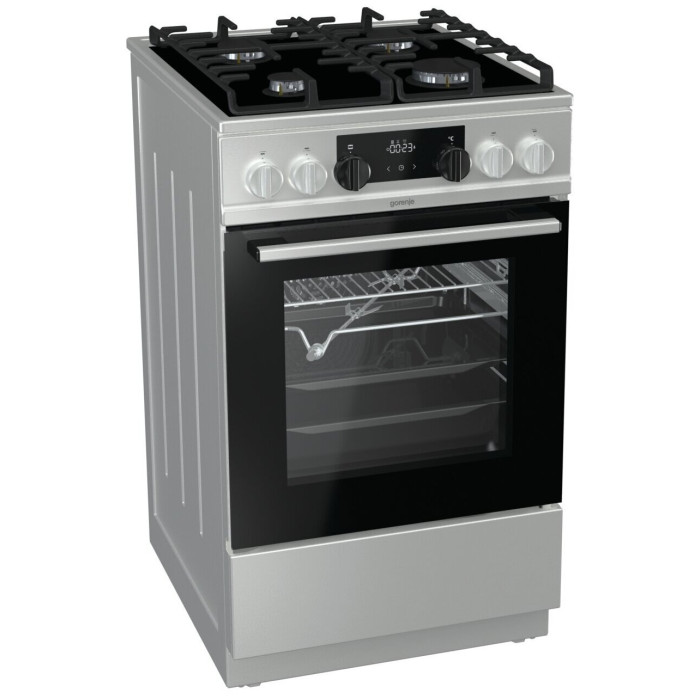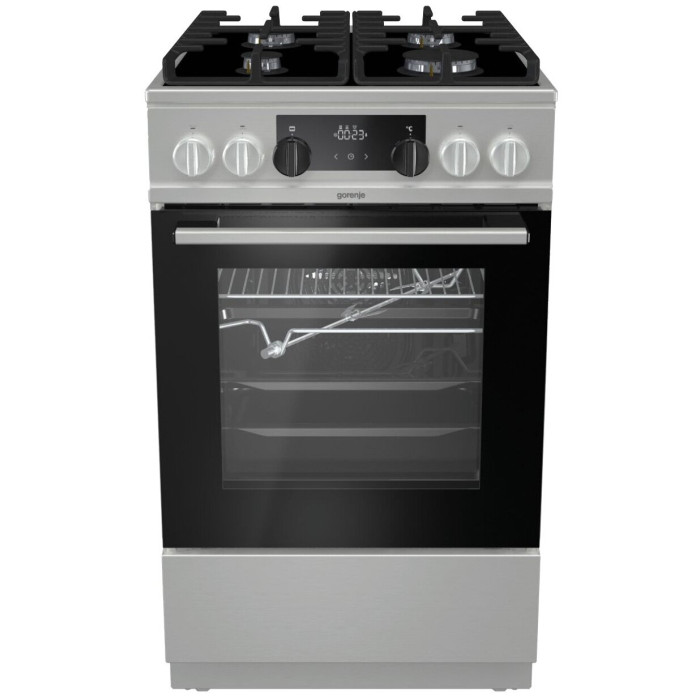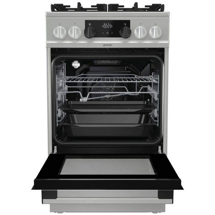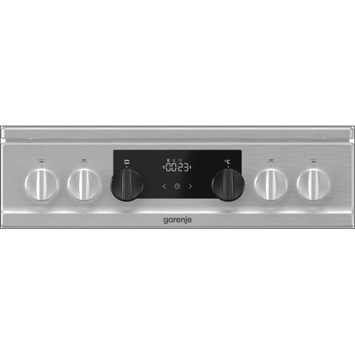Комбинированная плита Gorenje KC5355XV — современная и стильная техника, объединяющая духовой шкаф и варочную панель. Она выполнена в актуальных сочетаниях чёрного и нержавеющей стали. Особенно интересно смотрится полностью тёмная поверхность конфорок с чугунными держателями. Эргономичные ручки оснащены функцией автоматического электроподжига, который зажигает огонь горелок без спичек. Удобный программатор также имеет поворотные переключатели и дополнен сенсорным дисплеем IconLED.
