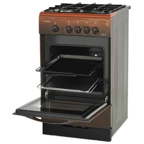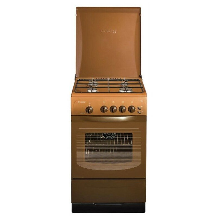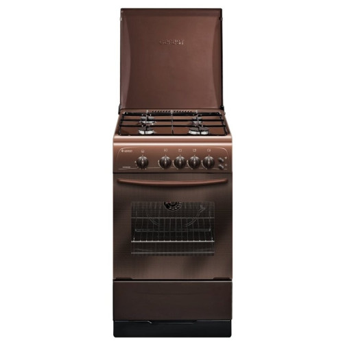 Газовая плита с эмалированными фасадом и рабочей поверхностью, дополненная металлической крышкой, ширина 50 см. Дополнительно, для хранения посуды, есть выдвижной ящик. Классический дизайн и интуитивно понятное управление, модель замечательно впишется в интерьер.