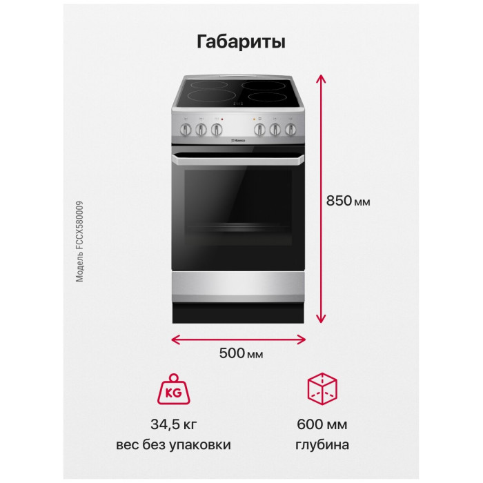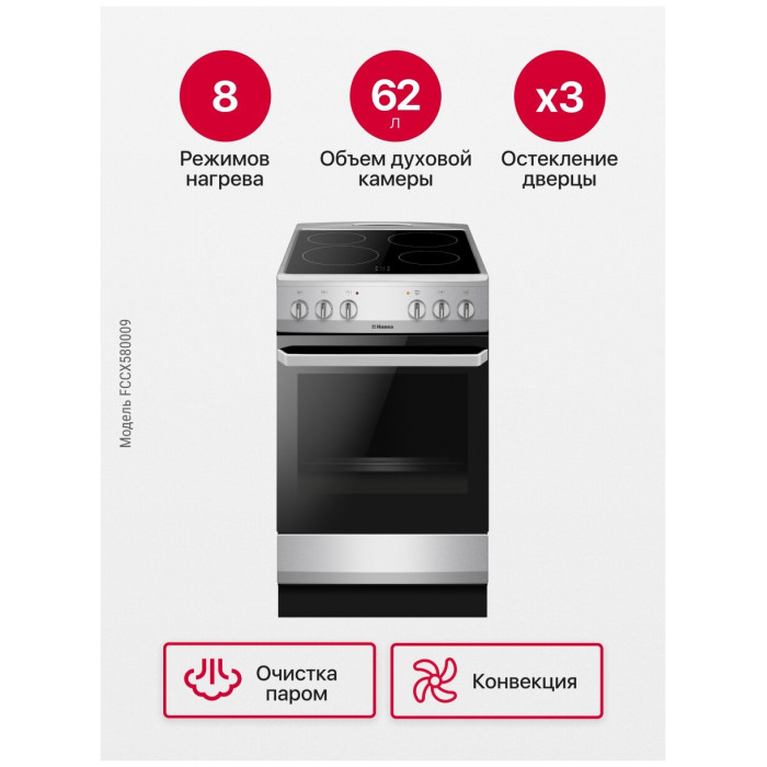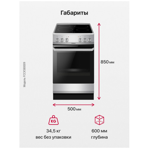 тип: электрическая, тип духовки: электрическая, тип варочной панели: электрическая, материал рабочей поверхности: стеклокерамика, ширина: 50 см, глубина: 60 см, количество конфорок: 4, конвекция в духовке, особенности конструкции: ящик для посуды, подсветка духовки, дополнительные функции: термостат