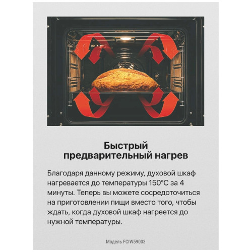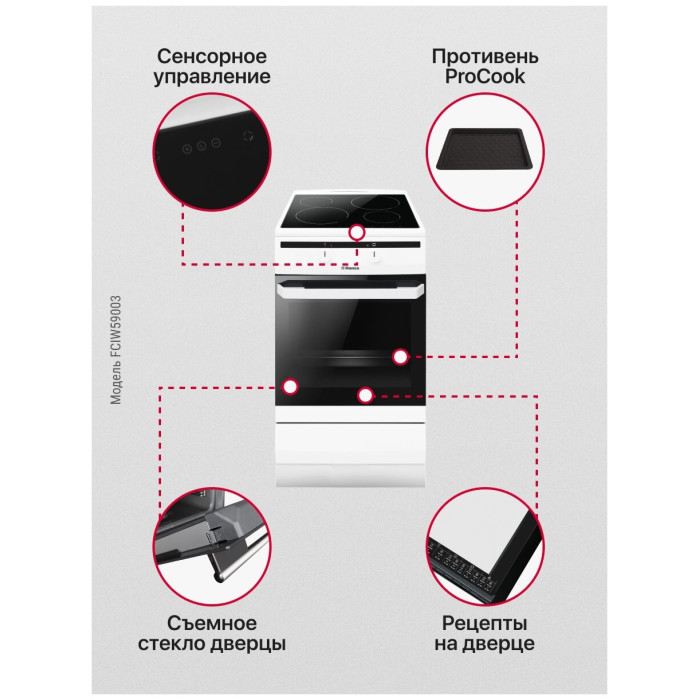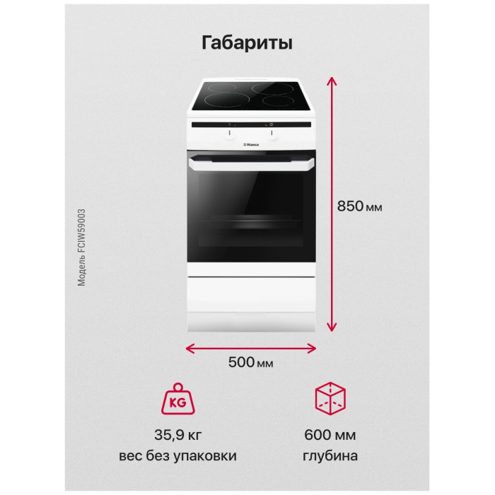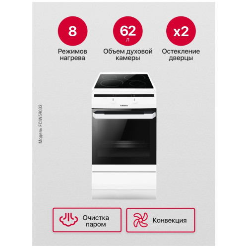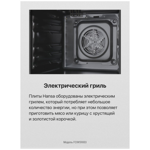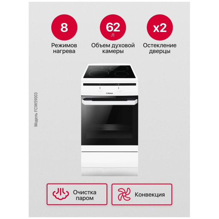 тип: электрическая, тип духовки: электрическая, тип варочной панели: индукционная, материал рабочей поверхности: стеклокерамика, ширина: 50 см, глубина: 60 см, количество конфорок: 4, конвекция в духовке, гриль, особенности конструкции: подсветка духовки, дополнительные функции: термостат, очистка духовки: традиционная