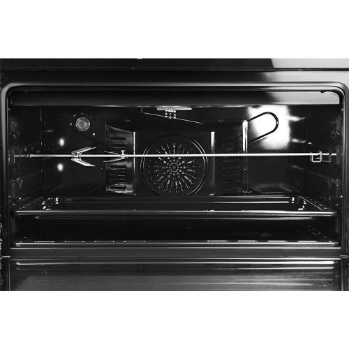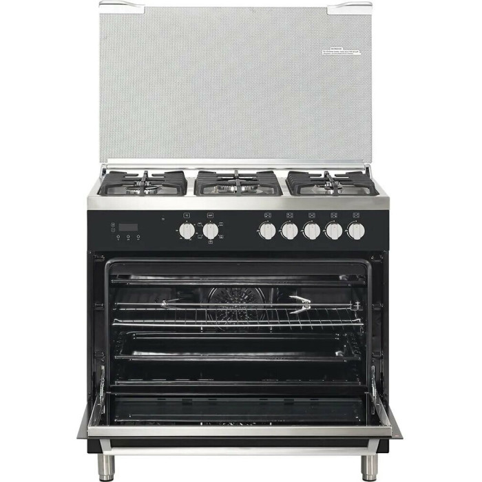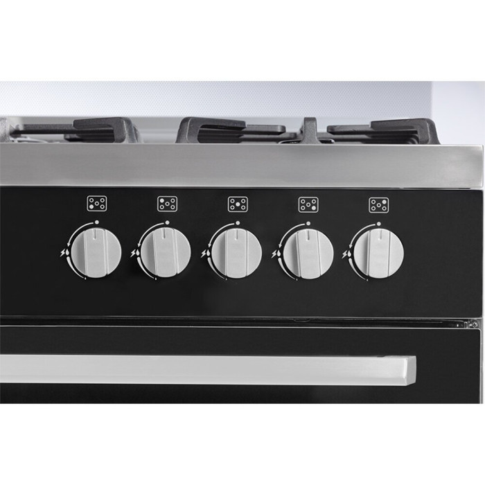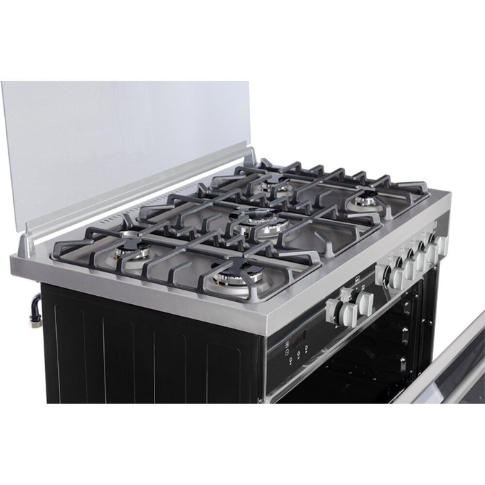 тип: электрическая, тип духовки: электрическая, тип варочной панели: газовая, материал рабочей поверхности: нерж. сталь, ширина: 90 см, глубина: 60 см, количество конфорок: 5, электроподжиг: варочная поверхность, газ-контроль: конфорок, конвекция в духовке, гриль, особенности конструкции: вертел, подсветка духовки, чугунные решетки, ящик для посуды, кольцевой нагревательный элемент в духовке, сенсорный таймер с дисплеем, дополнительные функции: таймер, термостат, газ-контроль конфорок, электророзжиг от ручки автоматический, тип таймера: звуковой, безопасность: газ-контроль конфорок, очистка духовки: традиционная