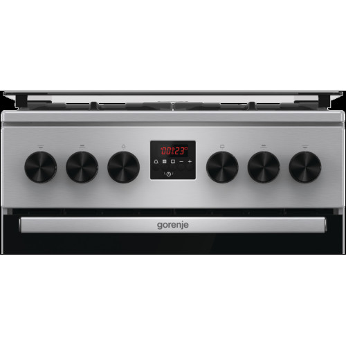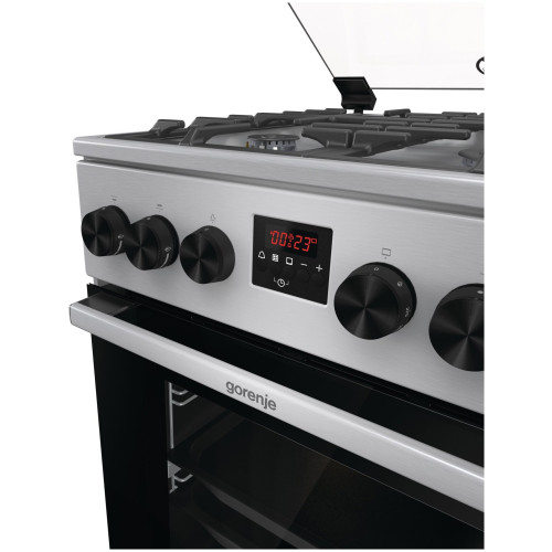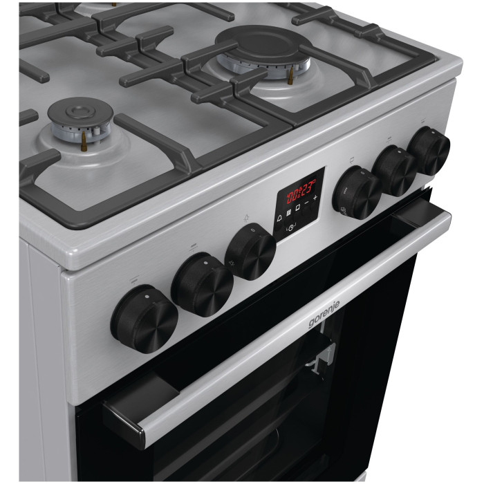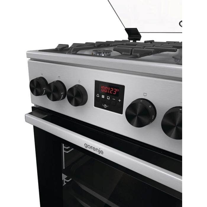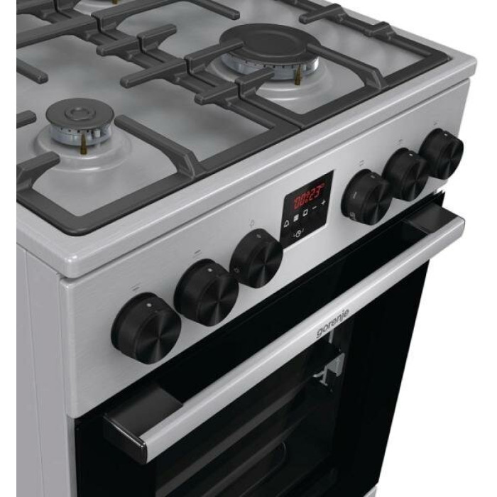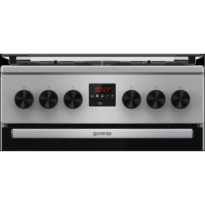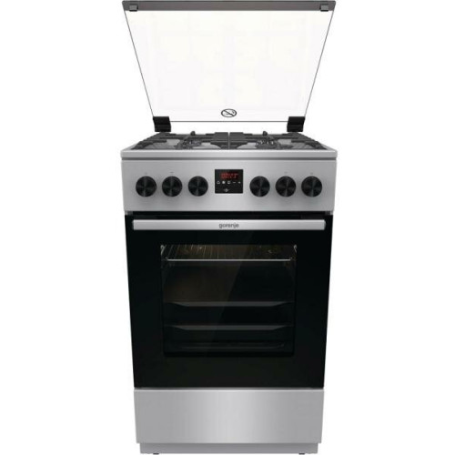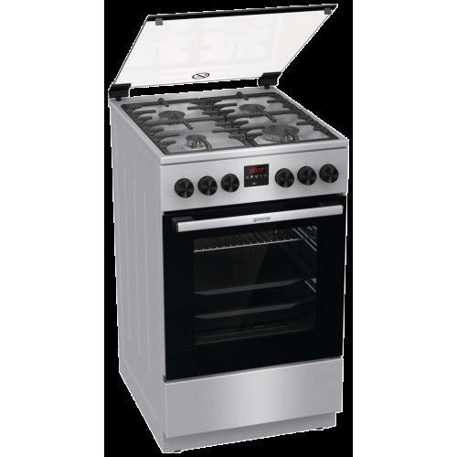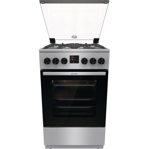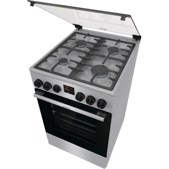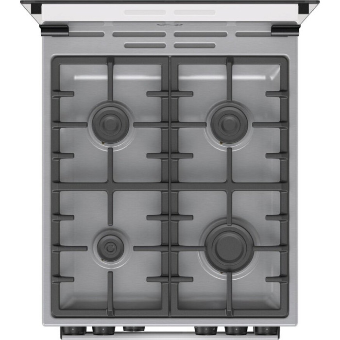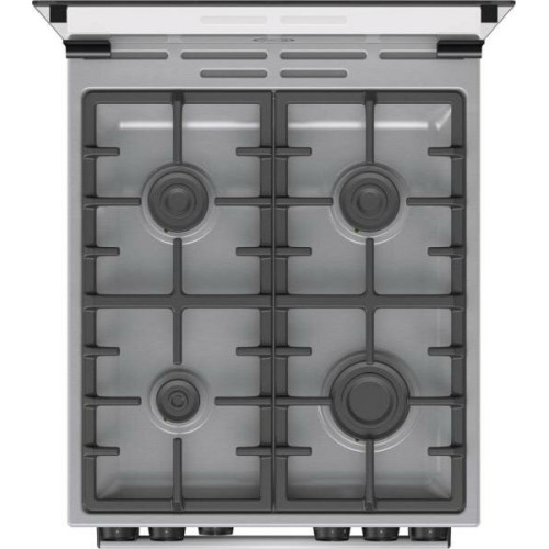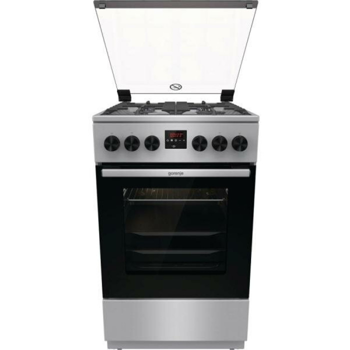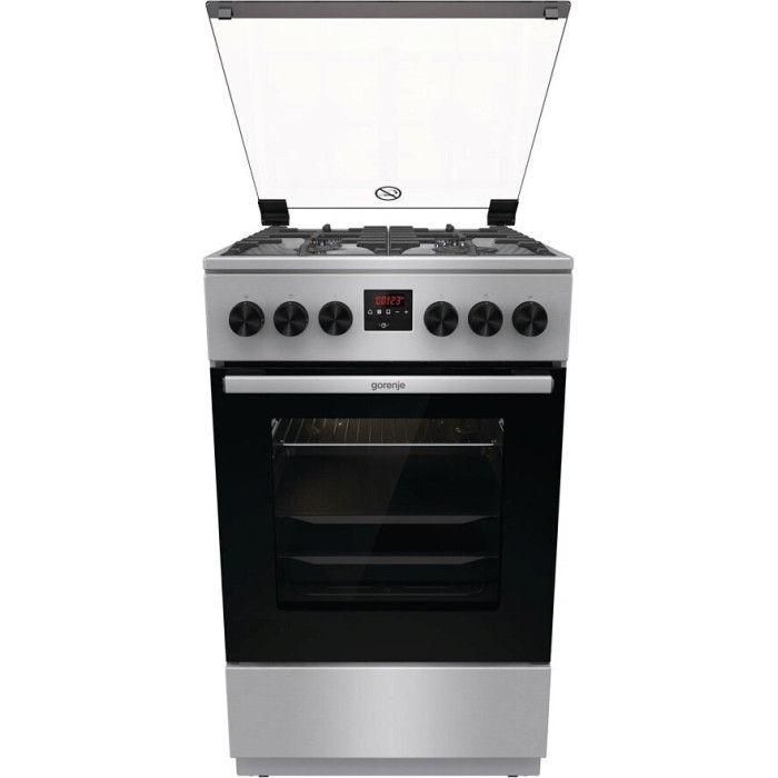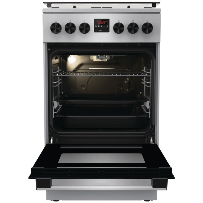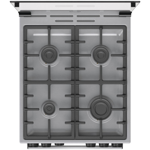 тип: газовая, тип духовки: газовая, тип варочной панели: газовая, материал рабочей поверхности: эмалированная сталь, ширина: 50 см, глубина: 59.40 см, количество конфорок: 4, электроподжиг: варочная поверхность + духовой шкаф, газ-контроль: духовки, конфорок, гриль, особенности конструкции: дисплей, подсветка духовки, часы, чугунные решетки, ящик для посуды, тип таймера: звуковой, очистка духовки: традиционная
