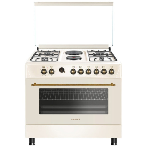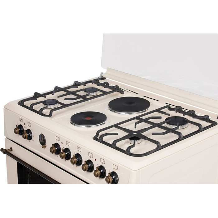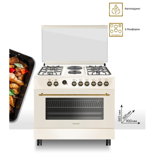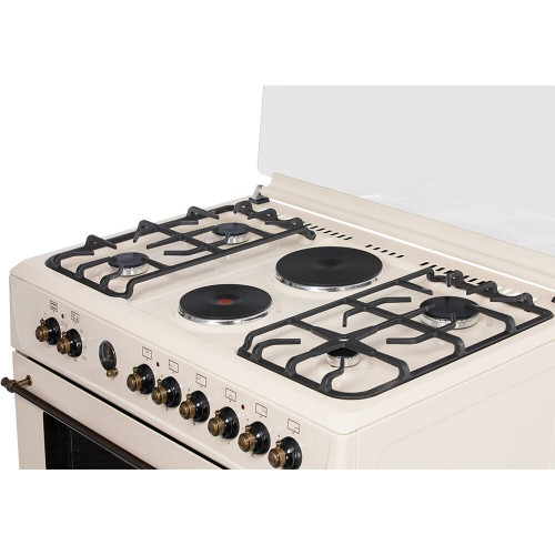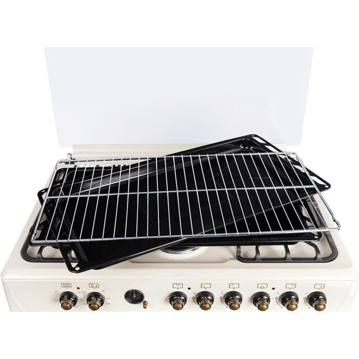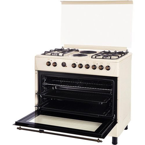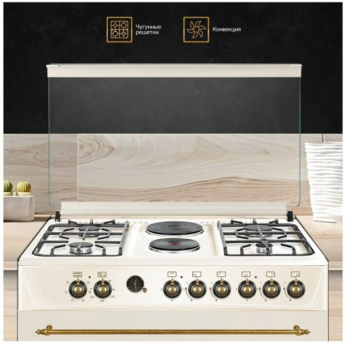 тип: комбинированная, тип духовки: электрическая, тип варочной панели: газовая, материал рабочей поверхности: эмалированная сталь, ширина: 90 см, глубина: 60 см, количество конфорок: 6, электроподжиг: варочная поверхность, газ-контроль: конфорок, конвекция в духовке, гриль, дополнительные функции: термостат