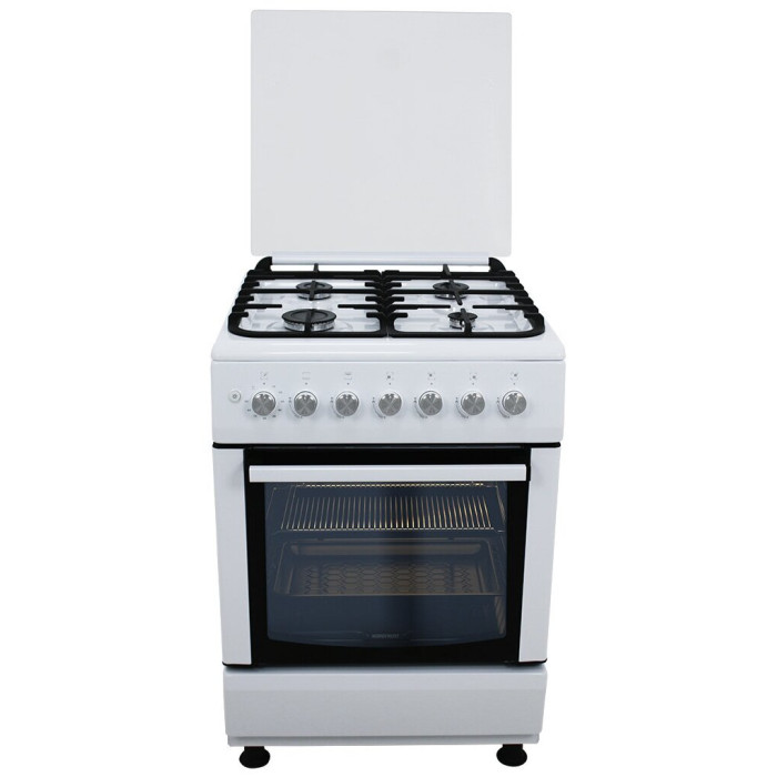 тип: газовая, тип духовки: газовая, тип варочной панели: газовая, материал рабочей поверхности: эмалированная сталь, ширина: 60 см, глубина: 60 см, количество конфорок: 4, электроподжиг: варочная поверхность + духовой шкаф, газ-контроль: духовки, конфорок, особенности конструкции: подсветка духовки, эмаль легкой чистки, ящик для посуды, очистка духовки: традиционная