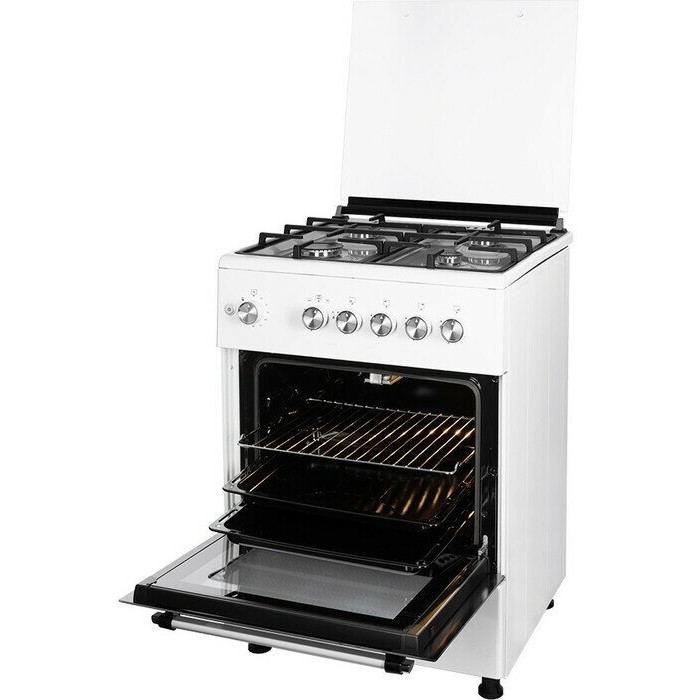 тип: газовая, тип духовки: газовая, тип варочной панели: газовая, материал рабочей поверхности: эмалированная сталь, ширина: 60 см, глубина: 60 см, количество конфорок: 4, электроподжиг: варочная поверхность, газ-контроль: духовки, конфорок, конвекция в духовке, гриль, дополнительные функции: термостат