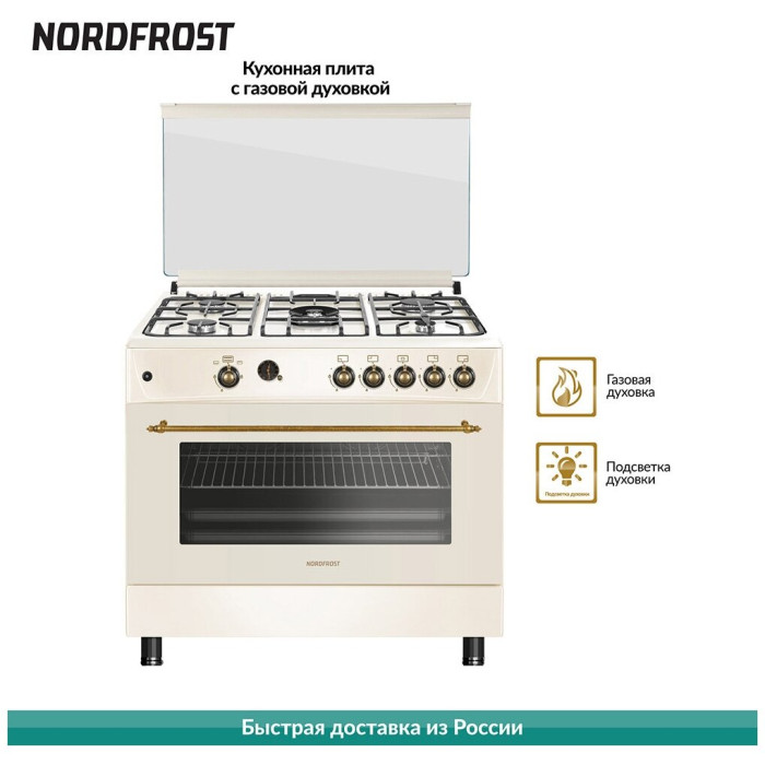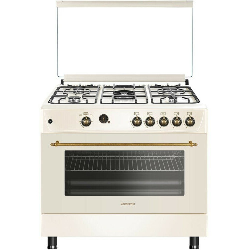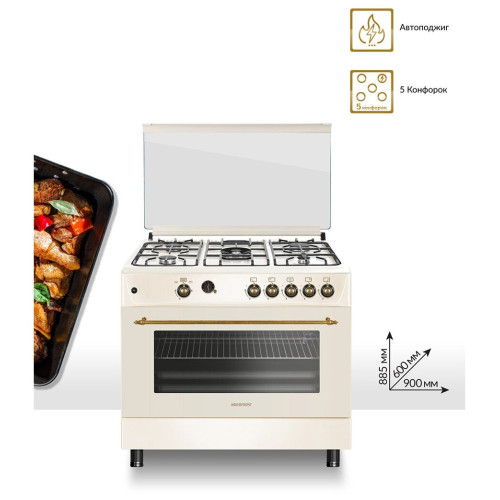 тип: газовая, тип духовки: газовая, тип варочной панели: газовая, материал рабочей поверхности: эмалированная сталь, ширина: 90 см, глубина: 60 см, количество конфорок: 5, электроподжиг: варочная поверхность, газ-контроль: духовки, конфорок, конвекция в духовке, гриль