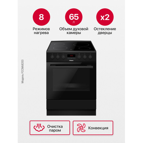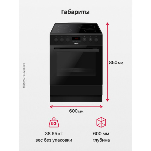 Hansa FCCM68203 имеет духовой шкаф объемом 65 л и 4 конфорки на варочной панели. Индикатор остаточного тепла сообщает о том, что зона нагрева все еще остается горячей, несмотря на то, что она уже выключена. В целях безопасности каждая зона нагрева оборудована системой автоматического отключения. Функция конвекция обеспечивает улучшенное распределение жара и постоянную циркуляцию воздуха внутри духового шкафа. Это сокращает время приготовления, а также позволяет добиться более равномерного пропекания и золотистой корочки.