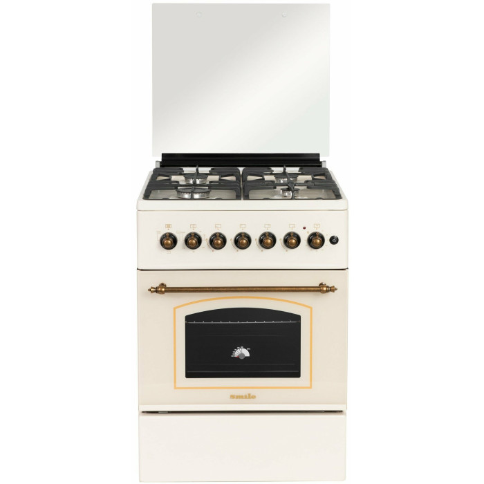 Плита комбинированная SMILE SM6GER210 бежевый (г/к, ретро, стекл. кр, чугун, подсв, розжиг, таймер). Газовая плита Smile SM6GER210 бежевая предлагает сочетание четырех газовых конфорок и электрического духового шкафа. Газовые конфорки защищены чугунными решетками и газ-контролем. Объем электрической духовки 64 литра с противнем и решеткой для запекания продуктов сделает процесс запекания продуктов быстрым и удобным. Данная модель оснащена кнопкой розжига верхних конфорок и духовки. Духовой шкаф работает от электричества и оснащен турбовентилятором (конвекцией), подсветкой, термостатом и термоуказателем на дверце духовки. Дизайн газовой плиты с электрической духовкой Smile SM6GER210 выполнен в ретро-стиле (изящные переключатели, ручки, цветовое решение газовой плиты). Стеклянная крышка убережет вашу стену от брызг во время готовки (размер стеклянной крышки 65 см на 75 см. Механический таймер поможет вам контролировать время приготовления блюда. Данная модель подойдет для большой семьи, которая выбирает надежность, долговечность и изысканный стиль.