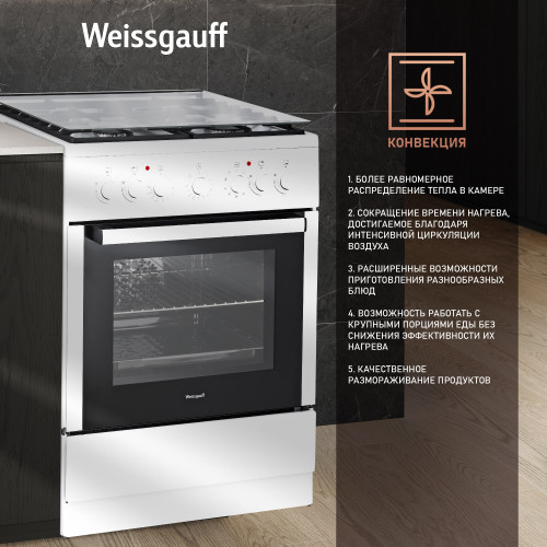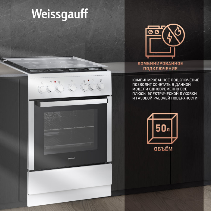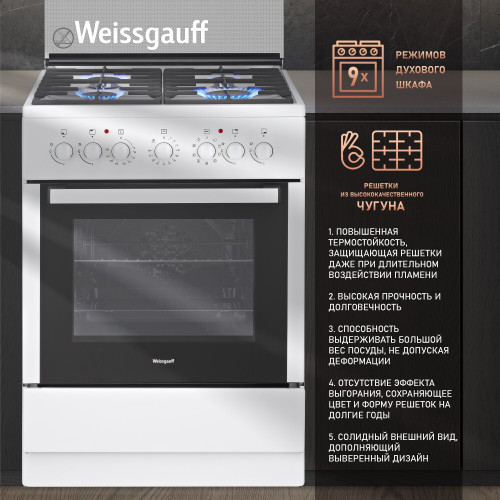мощность конфорок: 1х3 кВт, 2х2 кВт, 1х1 кВт; мощность духовки 3,5 кВт; 9 режимов духового шкафа; стеклянная крышка панели конфорок; регулируемые ножки; комплект для подключения сжиженного газа; вес товара - 44,2 кг