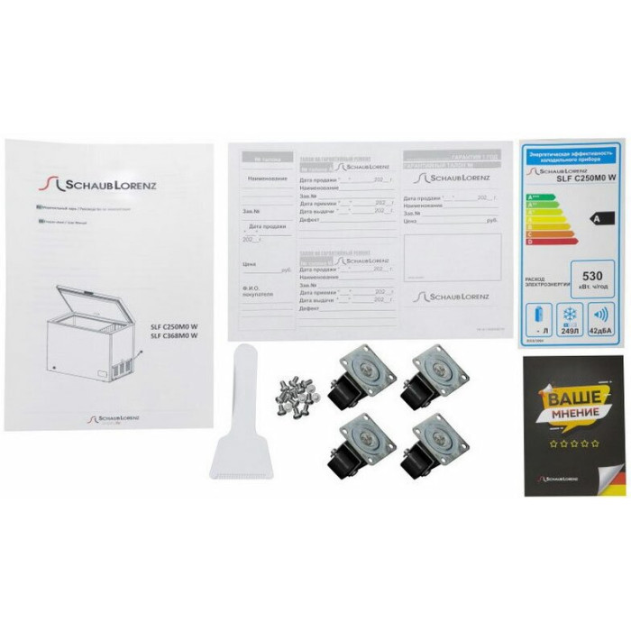 Комплектация: 2 встроенные корзины, скребок для льда, колеса для перемещения, инструкция, гарантийный талон