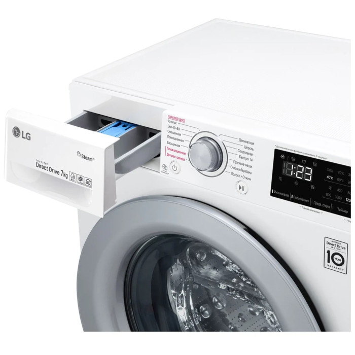дисплей, Автобалансировка, Детектор загрузки, Звуковой сигнал Вкл/Выкл, Инверторный мотор с прямым приводом, Индикатор Пуск/Пауза, Индикатор блокировки дверцы, Индикатор времени до конца цикла, Индикатор ошибок/Самодиагностика, Индикатор рабочего цикла, Индикатор скорости отжима, Индикатор температуры, Низкий уровень шума и вибрации, Пузырьковый барабан, Сенсорный дисплей, Система пеноподавления