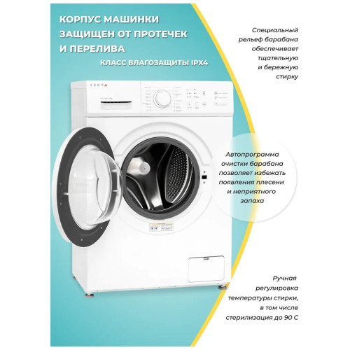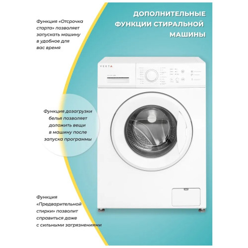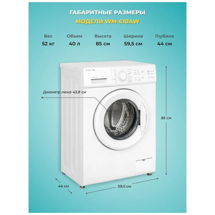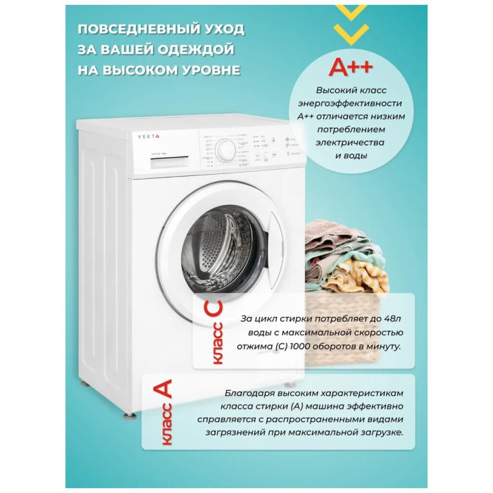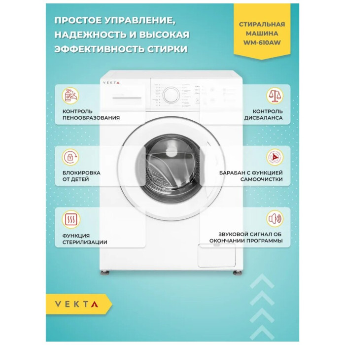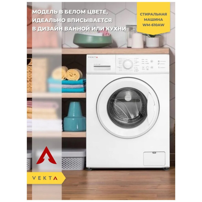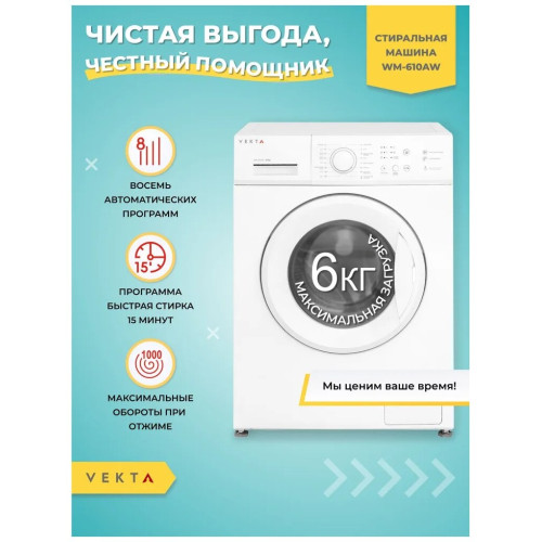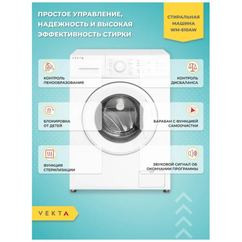 Отдельностоящая стиральная машина VEKTA WM - 610 BW с максимальной загрузкой 6 кг – оптимальное решение для домашнего использования, принимая во внимание простое управление, надежность и высокую эффективность стирки. Высший класс энергоэффективности А+++ характеризуется низким потреблением воды и электричества. Машинка VEKTA потребляет до 48 л воды за цикл стирки с максимальной скоростью отжима 1000 оборотов в минуту. Высокие характеристики класса стирки (А) говорит о том, что машина эффективно справляется с распространенными видами загрязнений при максимальной загрузке. Кнопочный тип управления позволяет выбрать необходимую программу с предустановленными настройками, отрегулировать температуру и скорость отжима. Световая индикация информирует о ходе выбранной программы, времени отложенного старта, старт/пауза и закрытии люка. Стиральная машина имеет 8 автоматических программ, в том числе:- режим быстрой стирки для слабозагрязненных вещей длительностью 15 минут;-функция «Предварительной стирки» позволит справиться даже с сильными загрязнениями;- функция «Отсрочки старта» позволяет запускать машинку в удобное для пользователя время;- отдельные программы для стирки разных видов тканей: хлопок, синтетика и т.д. дают возможность максимально точно подбирать наиболее щадящие и эффективные режимы стирки. - функция дозагрузки белья;- функция «Блокировка от детей» блокирует панель управления во время работы, тем самым защищая от случайного открытия дверцы и изменения настроек детьми; Датчик контроля пенообразования подаст сигнал машине, чтобы насос откачал лишнюю пену из барабана, тем самым повышается качество полоскания и предотвращается возможность выхода машинки из строя. Функция контроля дисбаланса равномерно распределяет белье внутри барабана, тем самым гарантирует низкий уровень шума при отжиме даже на самых высоких оборотах. Барабан выполнен из прочной высококачественной нержавеющей стали с функцией самоочистки, а его специальный рельеф обеспечивает тщательную и бережную стирку. Корпус машинки защищен от протечек и перелива, что гарантирует полную безопасность во время стирки. Модель выполнена в классическом белом цвете, поэтому идеально впишется в дизайн ванной или кухни. Загрузка фронтальная. Цвет белый.