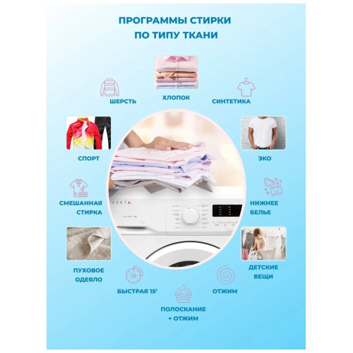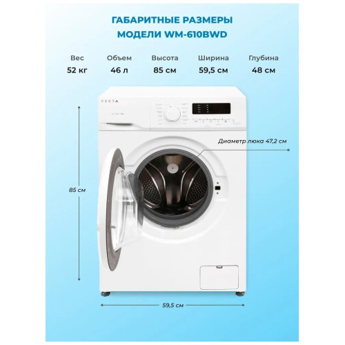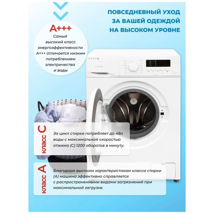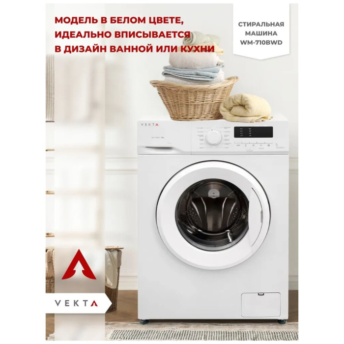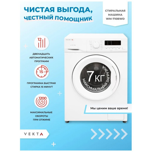 Отдельностоящая стиральная машина VEKTA WM-712BWD с максимальной загрузкой 6 кг – оптимальное решение для домашнего использования, принимая во внимание простое управление, надежность и высокую эффективность стирки. Высший класс энергоэффективности А+++ характеризуется низким потреблением воды и электричества. Машинка VEKTA потребляет до 48 л воды за цикл стирки с максимальной скоростью отжима 1200 оборотов в минуту. Высокие характеристики класса стирки (А) говорит о том, что машина эффективно справляется с распространенными видами загрязнений при максимальной загрузке. Кнопочный тип управления позволяет выбрать необходимую программу с предустановленными настройками, отрегулировать температуру и скорость отжима. На LED-дисплее световой индикацией отражается вся информация по режиму, старта/паузы, ходу выполнения программы, времени окончания отложенной стирки, индикация закрытого люка и неисправностей. Стиральная машина имеет 12 автоматических программ, в том числе:- режим быстрой стирки для слабозагрязненных вещей длительностью 15 минут;-функция «Предварительной стирки» позволит справиться даже с сильными загрязнениями;- функция «Отсрочки старта» позволяет запускать машинку в удобное для пользователя время;- отдельные программы для стирки разных видов тканей: хлопок, синтетика и т.д. дают возможность максимально точно подбирать наиболее щадящие и эффективные режимы стирки. - функция дозагрузки белья;- функция «Блокировка от детей» блокирует панель управления во время работы, тем самым защищая от случайного открытия дверцы и изменения настроек детьми; Датчик контроля пенообразования подаст сигнал машине, чтобы насос откачал лишнюю пену из барабана, тем самым повышается качество полоскания и предотвращается возможность выхода машинки из строя. Функция контроля дисбаланса равномерно распределяет белье внутри барабана, тем самым гарантирует низкий уровень шума при отжиме даже на самых высоких оборотах. Барабан выполнен из прочной высококачественной нержавеющей стали с функцией самоочистки, а его специальный рельеф обеспечивает тщательную и бережную стирку. Корпус машинки защищен от протечек и перелива, что гарантирует полную безопасность во время стирки. Модель выполнена в классическом белом цвете, поэтому идеально впишется в дизайн ванной или кухни. Загрузка фронтальная. Цвет белый.