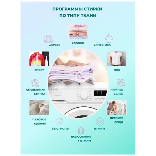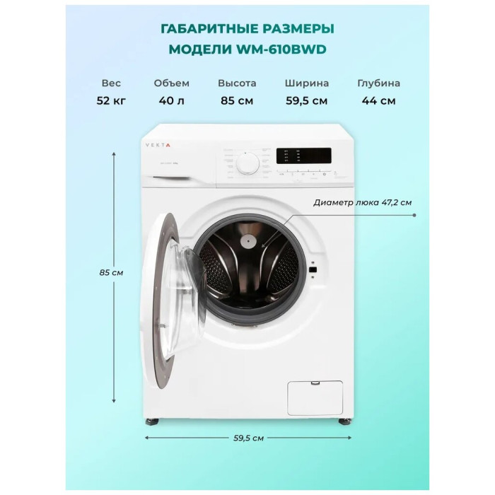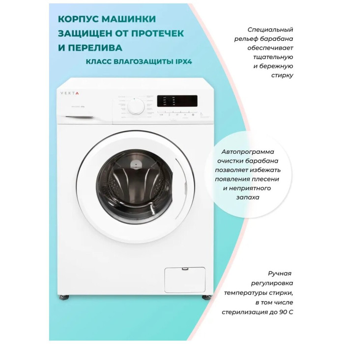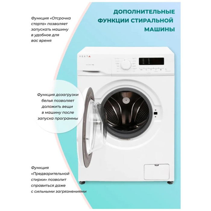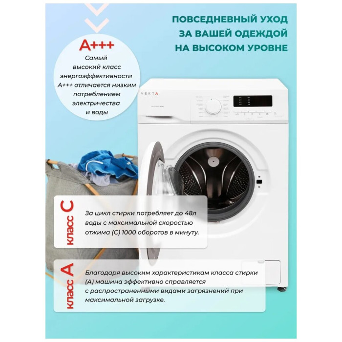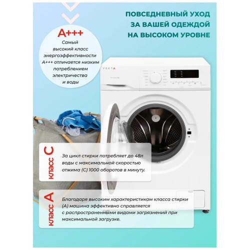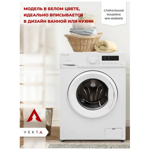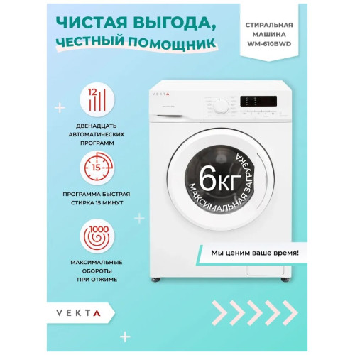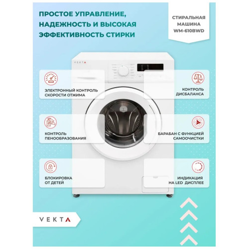 Отдельностоящая стиральная машина VEKTA WM-610BWD с максимальной загрузкой 6 кг – оптимальное решение для домашнего использования, принимая во внимание простое управление, надежность и высокую эффективность стирки. Высший класс энергоэффективности А+++ характеризуется низким потреблением воды и электричества. Машинка VEKTA потребляет до 48 л воды за цикл стирки с максимальной скоростью отжима 1000 оборотов в минуту. Высокие характеристики класса стирки (А) говорит о том, что машина эффективно справляется с распространенными видами загрязнений при максимальной загрузке. Кнопочный тип управления позволяет выбрать необходимую программу с предустановленными настройками, отрегулировать температуру и скорость отжима. На LED-дисплее световой индикацией отражается вся информация по режиму, старта/паузы, ходу выполнения программы, времени окончания отложенной стирки, индикация закрытого люка и неисправностей. Стиральная машина имеет 12 автоматических программ, в том числе:- режим быстрой стирки для слабозагрязненных вещей длительностью 15 минут;-функция «Предварительной стирки» позволит справиться даже с сильными загрязнениями;- функция «Отсрочки старта» позволяет запускать машинку в удобное для пользователя время;- отдельные программы для стирки разных видов тканей: хлопок, синтетика и т.д. дают возможность максимально точно подбирать наиболее щадящие и эффективные режимы стирки. - функция дозагрузки белья;- функция «Блокировка от детей» блокирует панель управления во время работы, тем самым защищая от случайного открытия дверцы и изменения настроек детьми; Датчик контроля пенообразования подаст сигнал машине, чтобы насос откачал лишнюю пену из барабана, тем самым повышается качество полоскания и предотвращается возможность выхода машинки из строя. Функция контроля дисбаланса равномерно распределяет белье внутри барабана, тем самым гарантирует низкий уровень шума при отжиме даже на самых высоких оборотах. Барабан выполнен из прочной высококачественной нержавеющей стали с функцией самоочистки, а его специальный рельеф обеспечивает тщательную и бережную стирку. Корпус машинки защищен от протечек и перелива, что гарантирует полную безопасность во время стирки. Модель выполнена в классическом белом цвете, поэтому идеально впишется в дизайн ванной или кухни. Загрузка фронтальная. Цвет белый.