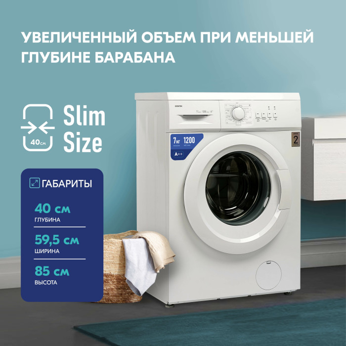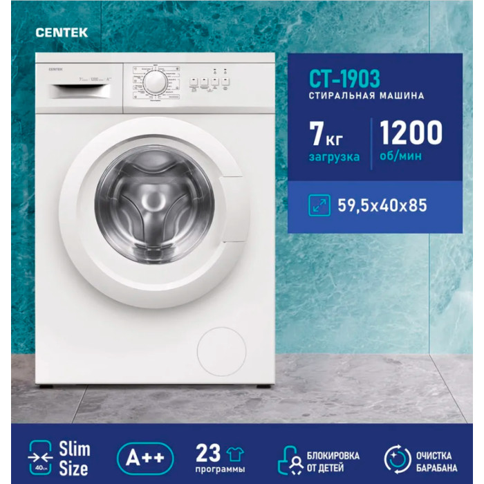 Стильная, быстрая и надежная стиральная машина CENTEK CT-1903 с легкостью управляется с большим количеством белья до 7 кг. За час вы можете получить чистую и свежую одежду, благодаря максимальной скорости отжима 1200 об/мин. Барабан стиральной машины имеет объем 45 л, что позволяет вам подавать больше белья. Класс A++ гарантирует эффективность и экономию электроэнергии при каждом использовании.