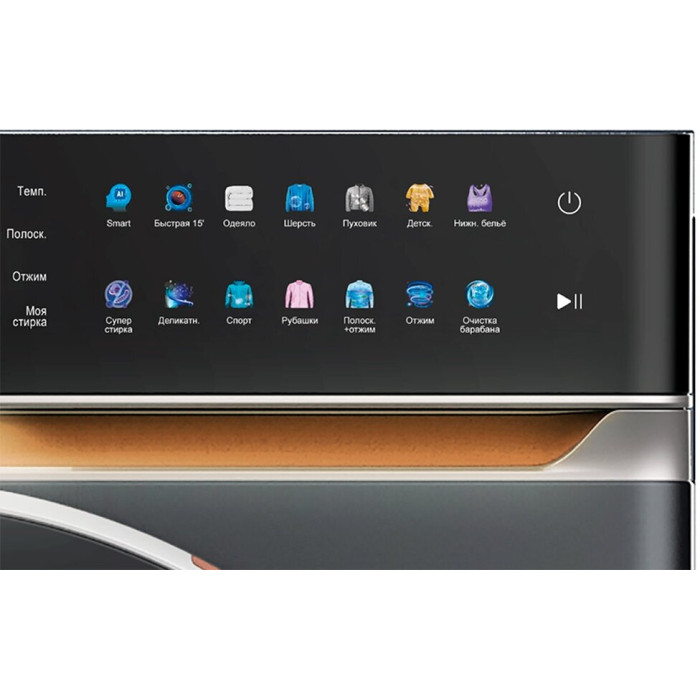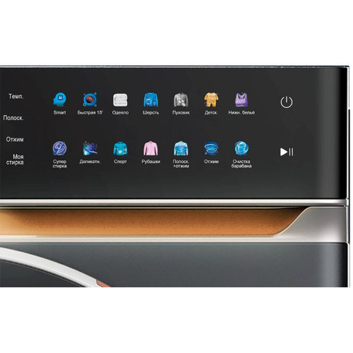 выбор скорости отжима, выбор температуры стирки, интеллектуальное управление стиркой, контроль баланса, контроль за уровнем пены, отложенный старт, очистка барабана, сигнал окончания стирки