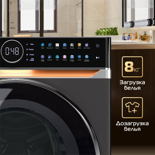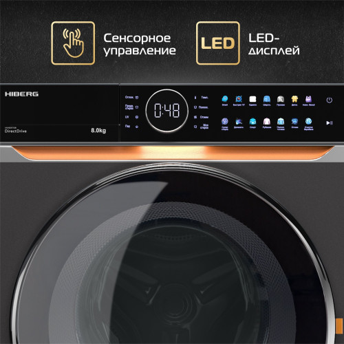 Стиральная машина HIBERG i-DDQ10 - 814 с инверторным мотором и системой прямого привода отстирывает до 8 кг сухого белья за 1 цикл.