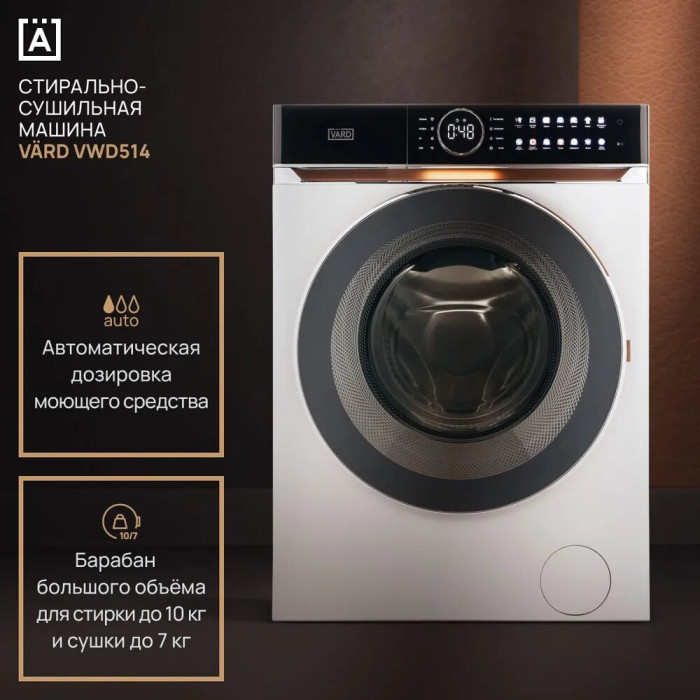 Стирально-сушильная машина VARD VWD514 белого цвета и вставками из эко-кожи сочетает в себе премиальный дизайн и передовые технологии. Вместительный барабан позволяет с лёгкостью справляться с большими объёмами: за один цикл можно постирать до 10 килограммов одежды, а высушить — до 7 килограммов. Высокоскоростной режим отжимает бельё и одежду на скорости 1400 оборотов в минуту, значительно повышает эффективность отжима. Упрощённая конструкция DD Invertor Motor не имеет промежуточного звена в виде ремня или других трущихся частей, которые со временем изнашиваются. Такое решение более надёжное и долговечное, эргономичное и тихое в работе. В инверторном компрессоре, как и в инверторном приводе, отсутствуют щётки и трущиеся части, что обеспечивает высокую надёжность, тихую работу и меньшее потребление электроэнергии. Стиральная машина VARD VWD514 с функцией автодозировки самостоятельно определяет необходимое количество моющего средства в зависимости от веса и типа стираемого белья для качественной и более экономной стирки. Цветная сенсорная панель облегчает управление функциями стирально-сушильной машины и наглядно представляет информацию. Отложенный старт — функция, позволяющая начать стирку в удобное время — например, так, чтобы всё было готово к вашему возвращению домой. Гладкое покрытие и особая, выпуклая форма внутренней поверхности барабана стиральной машины снижают воздействие на одежду в процессе стирки: на вещах не остаётся зацепок, они меньше изнашиваются. Функция «Ночной режим» позволяет стирать бельё и одежду в особом, тихом режиме, подходящем для использования ночью. При отжиме машина работает на низких оборотах, что снижает шумовой фон и не мешает вашему отдыху. UV-луч — функция стиральной машины, которая активируется в конце постирочного цикла. Проходя через структуру ткани, ультрафиолет меняет структуру потенциально опасных микроорганизмов и предотвращает их дальнейшее размножение. Загрузка и разгрузка стиральной машины VARD VWD514 становятся намного проще благодаря встроенной LED-подсветке. Она автоматически включается при открывании люка и освещает внутреннее пространство ярким, но мягким светом. Светодиодные лампы долговечны, не требуют замены и могут работать в течение всего срока службы стиральной машины. Благодаря технологии прямого впрыска моющее средство полностью растворяется в волокнах ткани. Так бельё и одежда лучше простирываются, а загрязнения эффективно удаляются. «Стирка и сушка за час» — комфортное решение, когда необходимо постирать и посушить небольшое количество белья или одежды за ограниченное время. Благодаря функции автодозирования машина самостоятельно определяет необходимое количество моющего средства в зависимости от веса и типа стираемого белья для качественной и более экономной стирки. Сенсорная панель, оснащённая цветным дисплеем, облегчает управление функциями бытовой техники и наглядно представляет всю необходимую информацию о процессе стирки. Инверторный мотор прямого привода обеспечивает бесшумную работу машины и возможность отжима на больших скоростях. Функция UV-луч активируется в конце цикла: проходя через ткань, ультрафиолет меняет структуру потенциально опасных микроорганизмов и предотвращает их дальнейшее размножение. Машина VARD VWD514 соответствует классу энерго