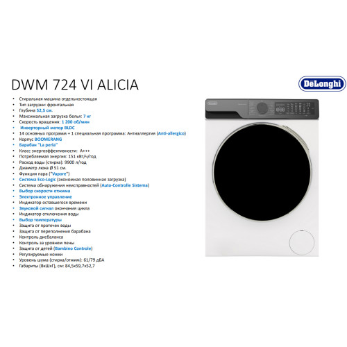 Стиральная машина DeLonghi DWM 724 VI Alicia - это отличный выбор для тех, кто ищет надежную и удобную стиральную машину. Она имеет максимальную загрузку белья до 7 кг и оснащена 15 программами стирки, включая быструю стирку, экономичную программу, стирку джинсов и многое другое.